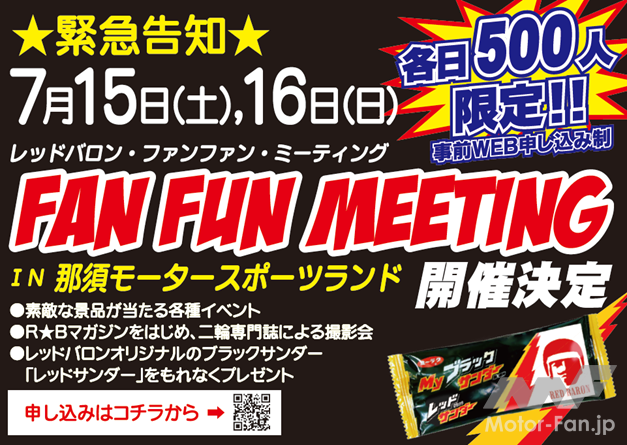 さてそんな“ユーザーファースト”のレッドバロンが主催している「Fan Funミーティング」が次回7月15日(土)、16日(日)の2日間に渡って、那須モータースポーツランドにて行われる。1回目の滋賀県(カイザーベルクびわ湖)、2回目の長崎県(新みなとイベント広場)に続く今回の3回目は栃木県にある那須モータースポーツランドでの開催となっている。