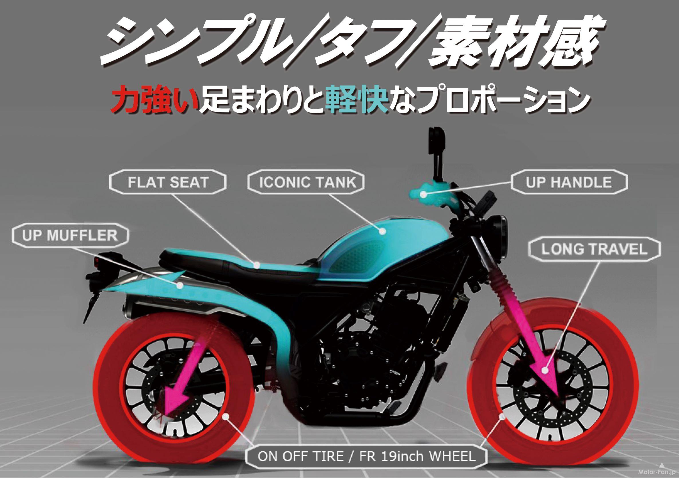 小数賀「レブルを開発している当時から、バリエーションモデルを作るかもしれないというフワッとした考えはありました。その後、ネオクラシックやカフェレーサーなども検討したうえで、世の中のアウトドアやキャンプブーム、4輪のSUV人気などを踏まえ、未舗装路も走れるスクランブラースタイルに決まりました」