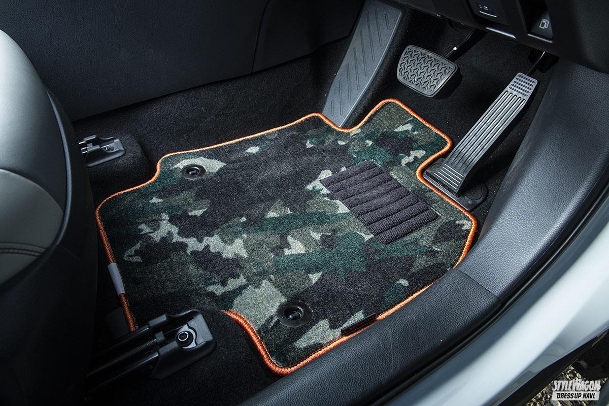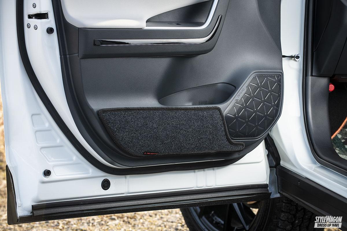 迷彩柄フロアマットやフローリング材に近い素材で作ったウッド調マットなど、内装関連も多数あり。乗降時の傷防止に役立つ洗えるドアマットやバックドア裏の追加LEDなどもぜひ欲しい。