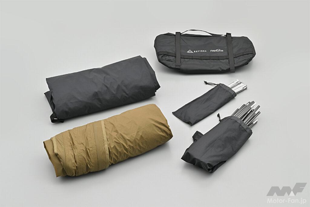 地面の敷地幅は余裕の260cm×210mmサイズ、高さは男性でも無理なく出入りできる143cmサイズを確保。一方、収納サイズはマットの収納袋と勘違いしそうな44cm×Φ18cm、重量3.4kgまでコンパクト化。「広くて快適なテントは持ち運びが困難で、積載も大変」という既存のバイク用テントの概念を打ち破る仕様に製作されている。