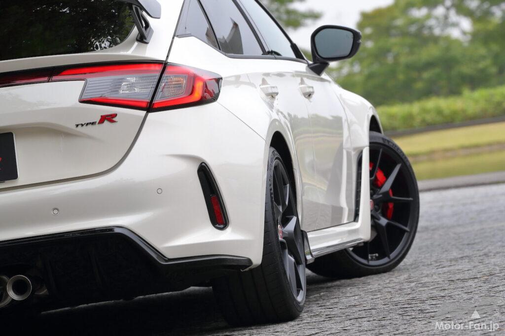 全幅が標準車のシビックより90mmも広がり、1890mmとなったFL5タイプRだが、たとえばリヤのワイドフェンダーは、265サイズのタイヤを収めるためだけではなく、ホイールアーチ周辺のノイズを低減することも狙った形状になっているという。