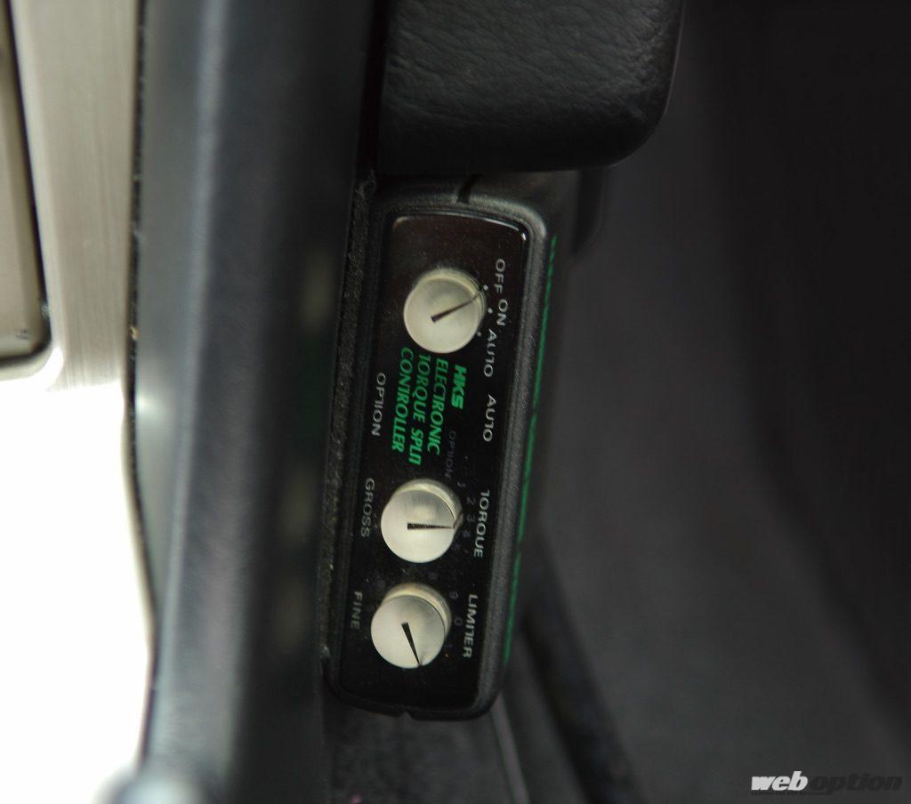 室内はシンプルなメイキングだ。コラム上にブーストコントローラーを配置し、センターコンソール脇にHKSのアテーサコントローラーをセット。なお、アテーサ制御に関しては、普段はトランスファーの保護も含めてイジらないようにしているという。それも長く乗る秘訣のひとつ。