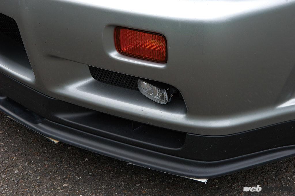 エクステリアはフルストック状態だ。ただし、純正リップは路面と擦ってるうちに割れてしまうため、保護目的でアルミの板を当てている。「一度割れると、そこから傷口が広がってしまうんですよね。このアルミ板だけでリップが長持ちするんです」とのこと。