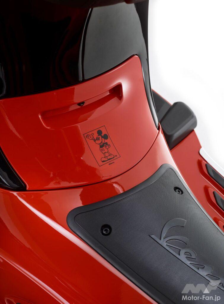 今回のコラボレーションでは、ベスパ・プリマベーラ125cc、150ccが、何十年にも渡ってウォルト・ディズニーの最も有名なマウスを象徴してきたカラーと同じ、ブラック、レッド、ホワイトそしてイエローのカラーリングを纏う。イエローのホイールはミッキーマウスの靴を連想させ、ブラックのミラーは特徴的な丸い耳を彷彿させる。