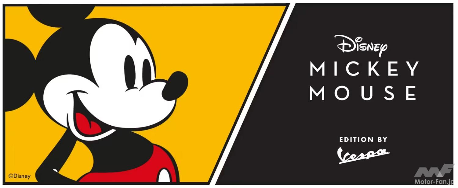 今回のコラボレーションでは、ベスパ・プリマベーラ125cc、150ccが、何十年にも渡ってウォルト・ディズニーの最も有名なマウスを象徴してきたカラーと同じ、ブラック、レッド、ホワイトそしてイエローのカラーリングを纏う。イエローのホイールはミッキーマウスの靴を連想させ、ブラックのミラーは特徴的な丸い耳を彷彿させる。