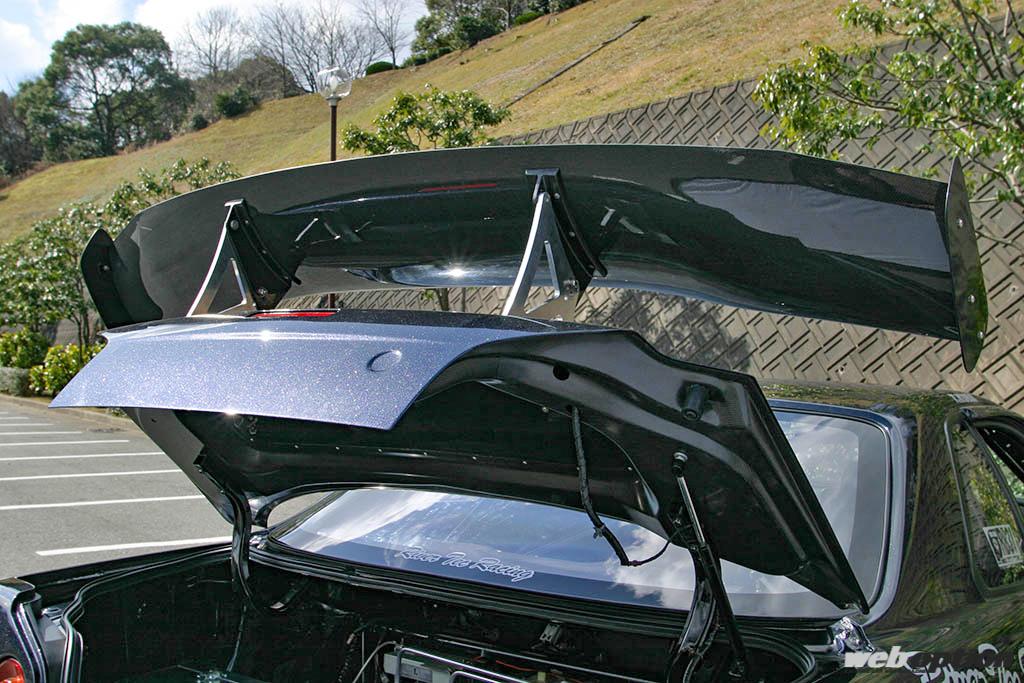 GTウイングやトランクパネル、左右ドア&フロントバンパーに至るまでカーボンパーツが使用され、車重はBNR34では驚異的な1300kg台にまで軽量化されている。