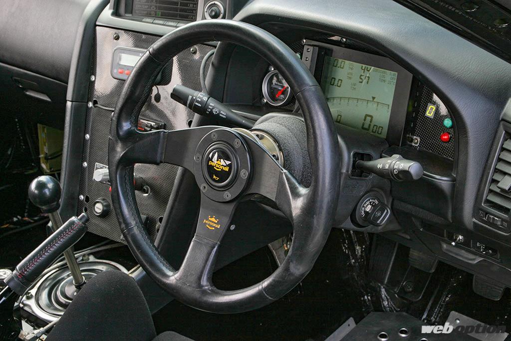 室内は超レーシーな仕上がりだ。メインメーターはマックスレーシングのオールインタイプで集中管理。ミッションはホリンジャー6速シーケンシャルを使用する。アンダーコートまで撤去され剥き出しになったフロアとクロスバー付きのロールケージがやる気を感じさせる。