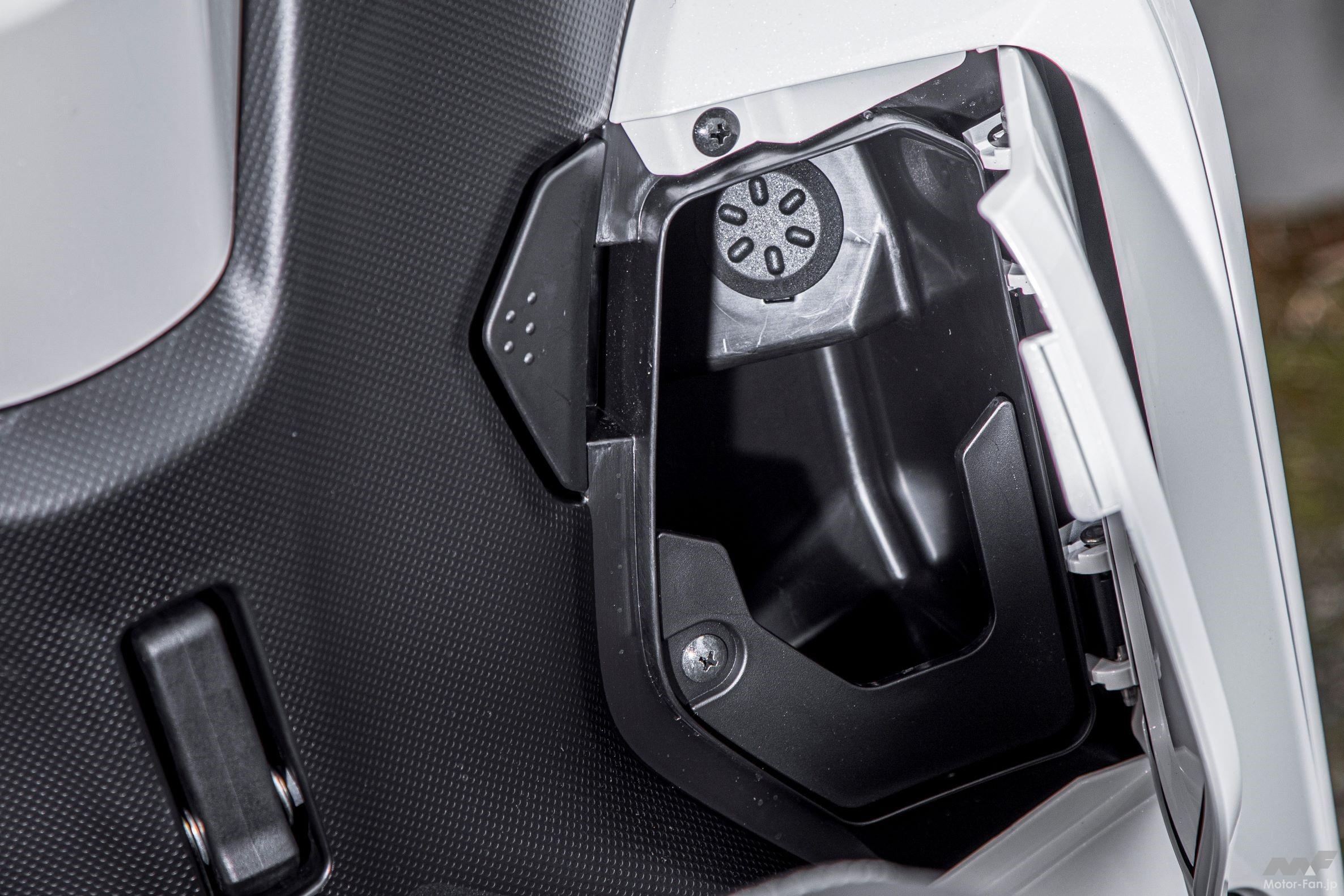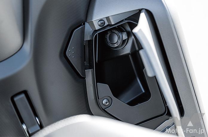 フロントトランク内に設けられている12V DCジャック。これも125は2023年モデルで省略されてしまった。なお、両車とも純正アクセサリーでこの位置に装着できるUSBソケット(¥4,400)が用意されている。