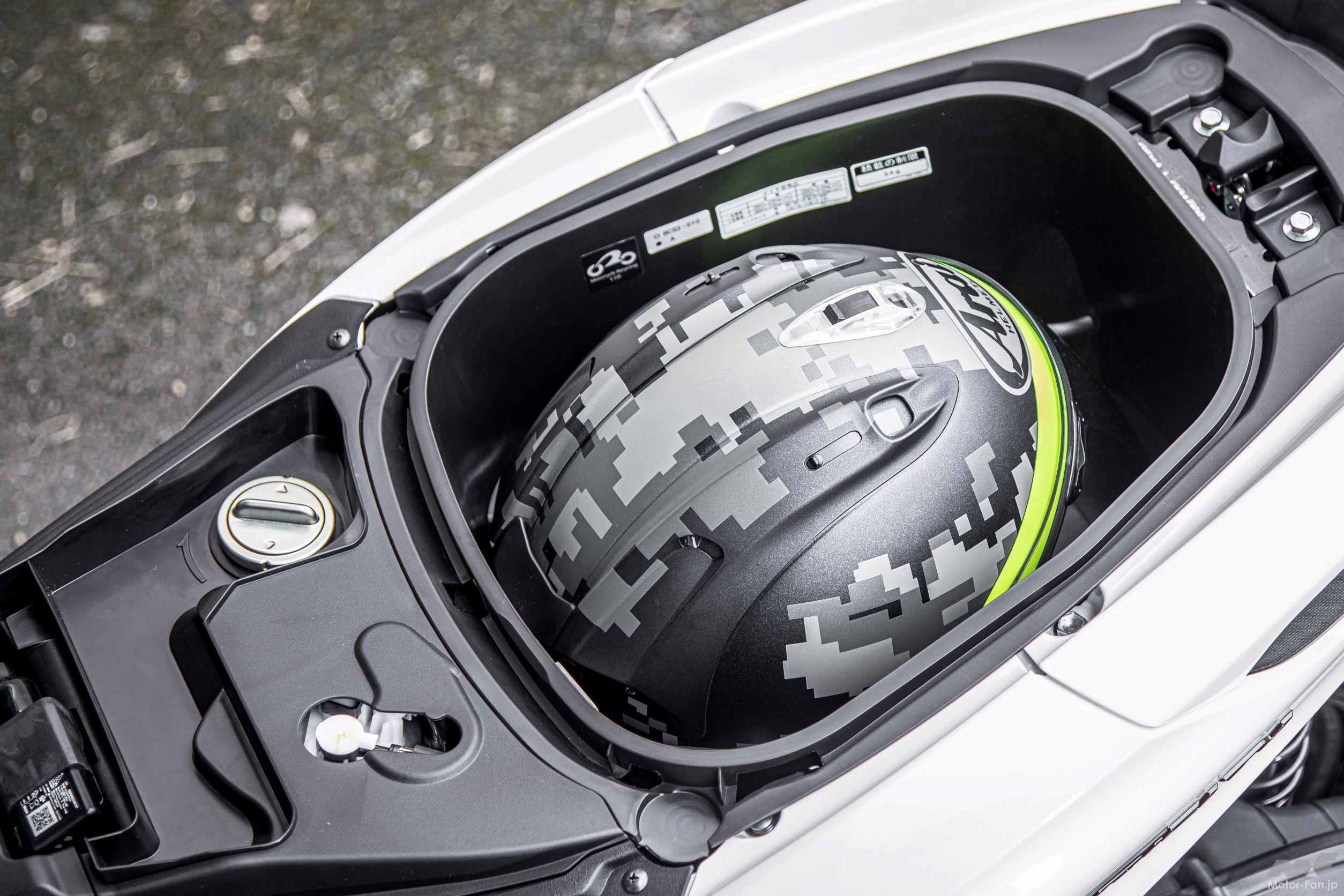 容量約23.5ℓのシート下トランクの形状は両車共通だが、125は2023年モデルでLED照明が省略されてしまったため、相対的に155の便利さが際立つことに。付け加えると、155は自動車専用道路を走れるため、純正アクセサリーでETC車載器が用意されている。
