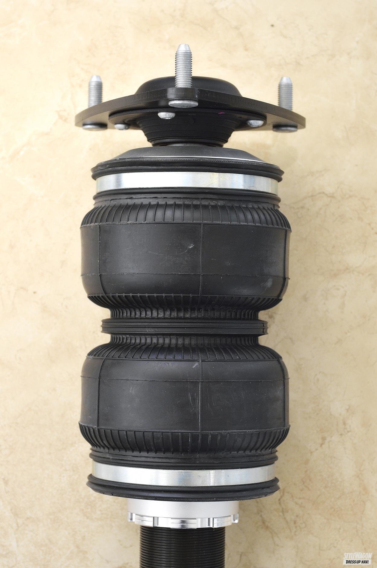 エアバッグ内の空気量によって車高が変わるのがエアサス。スペリオルのエアサスは、エアバッグの品質にもこだわっている。