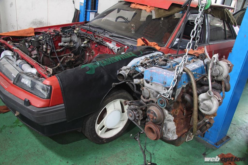 取材当日、ガレージ八幡に到着すると、すでにエンジンが降りていた。現役引退後、屋内保管されてたとはいっても、20年近く前に組まれたエンジンの中身が気になるわけで、しっかり組み直すために今の状態を確認して、必要ならばパーツも交換しなくてはならない。