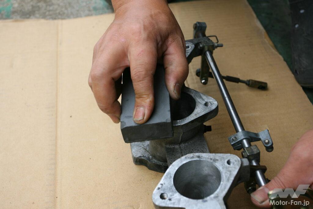 中古でキャブを購入した場合、インマニとの取り付け面が荒れていて、そこからエアを吸ってセッティングがずれてしまうケースがある。単にガスケットを新品にすれば解消する場合もあるが、左画像のようにオイルストーンで平らに整えてやると、その心配がグッと少なくなるので、どうせならここまでやっておこう。