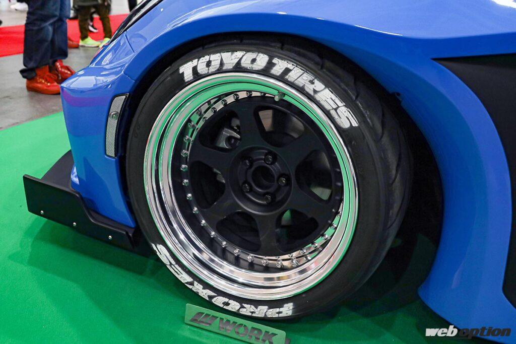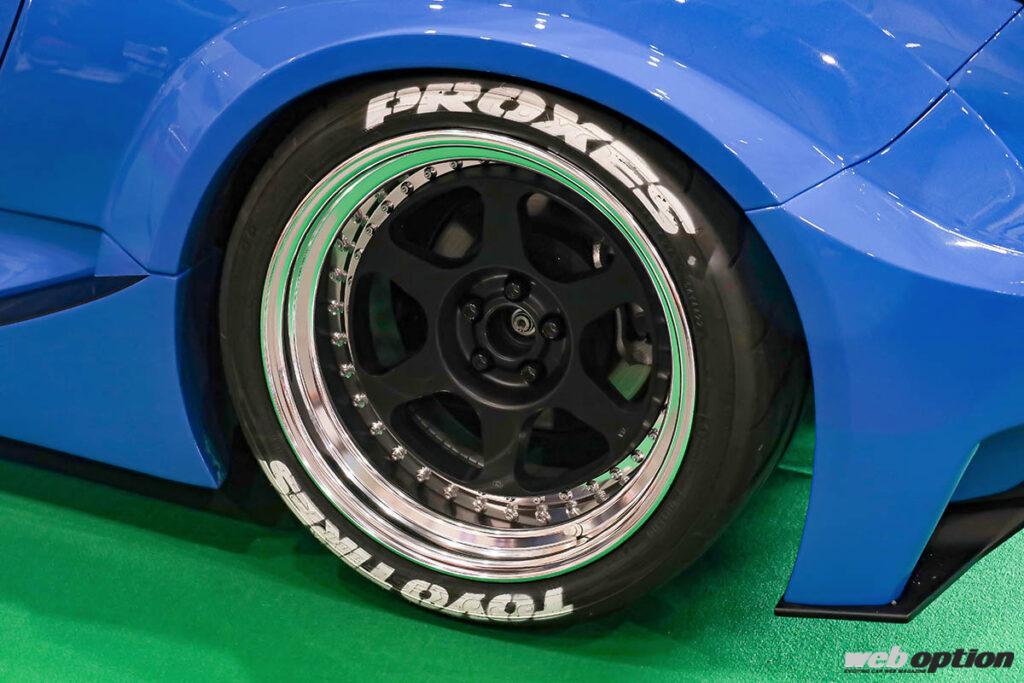 フロントのワイド幅は片側70mm。ホイールは11Jマイナス14というサイズのワークマイスターL1に、295/30R18サイズのプロクセスR888Rをセット。アッパーマウントでのキャンバー調整こそ行なっているものの、純正アーム類のままこのサイズのタイヤで全切り&サーキット走行も可能だ。
