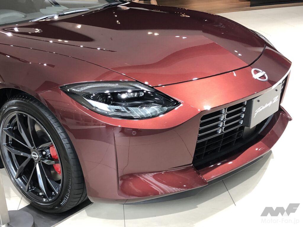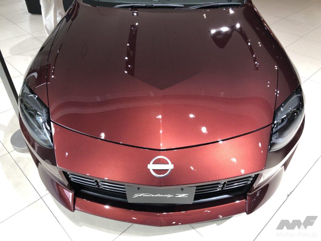 バーガンディーのZを見た瞬間に「おお、格好いいなあ」と思わず声を漏らしてしまった。フロントグリルの四角い形状が目立たず、それよりもボンネットの光の陰影による美しさの方に目を奪われる。初代フェアレディZ 240ZG(S30)のイメージカラー「マルーン」を彷彿とさせるこのボディカラーはZの美しさを際立たせ、50年以上に渡る歴史の重みを感じさせる。