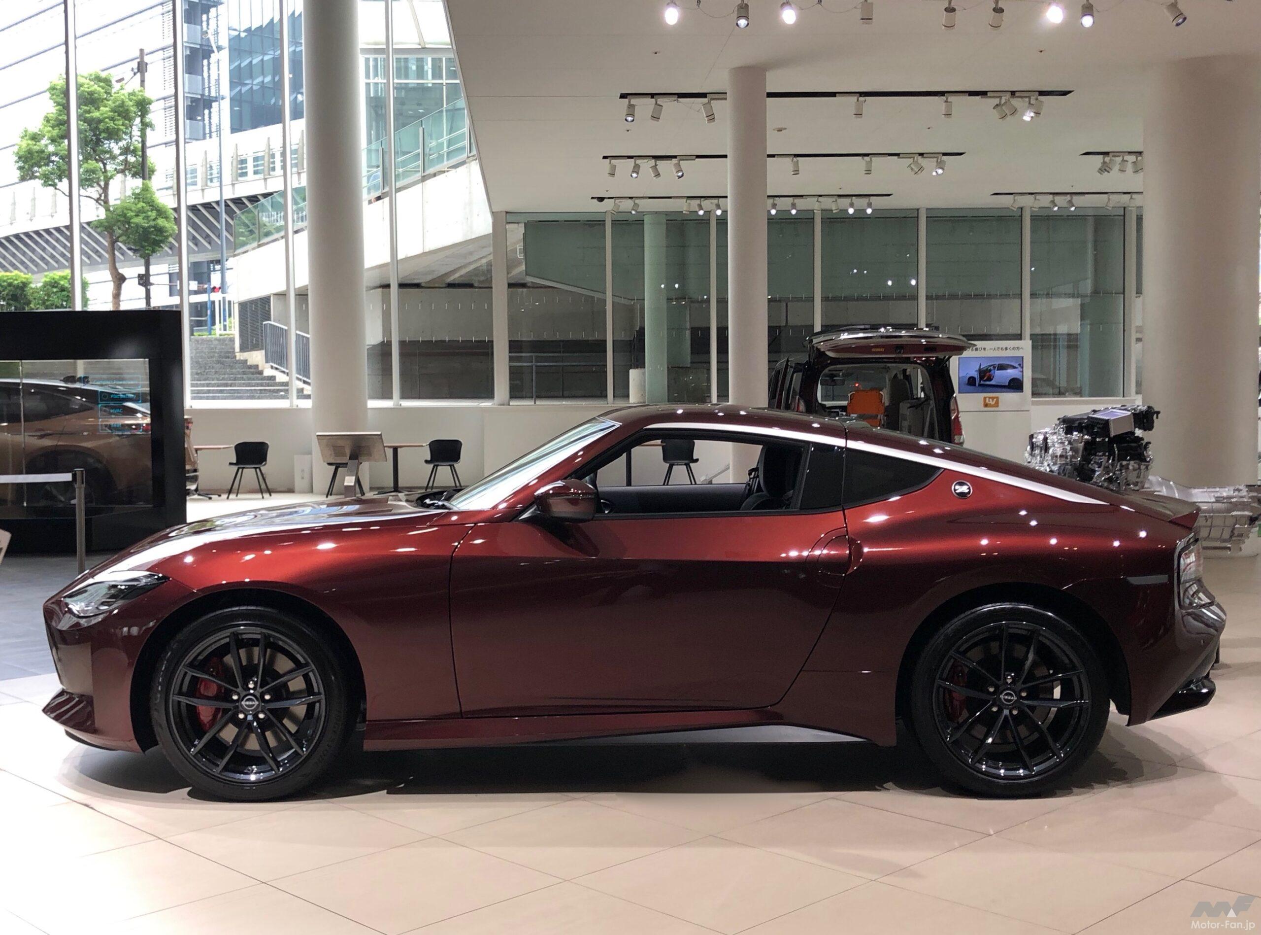 ガンメタリックのレイズ製19インチ鍛造ホイールとの組み合わせも落ち着いた雰囲気で素敵だ。そういえば、初代240ZGもガンメタリックのホイール、オーバーフェンダーなどでマルーンとの相性が良かった。落ち着いた中にもどこか凄みと重厚感のあるバーガンディーは、新型フェアレディZ(RZ34)の「大人のスポーツカー」としてのデザインの魅力を際立たせている。