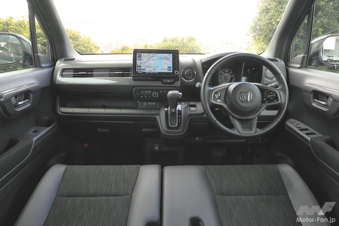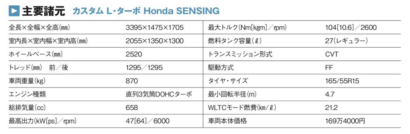 14インチタイヤを履く標準車の自然吸気モデルの乗り心地は文句なくクラス最上レベル。ストローク感とフラット感を両立した上質なタッチで快適そのもの。動力性能も十二分で、高速走行時の直進安定性も見事。15インチタイヤを履くカスタム系ほどではないにしても、カーブや山道での安定感も上々だ。何しろブレーキングによって減速制御を行なうCVTステップダウンシフトやリニアな加速感をもたらすGデザインシフト、新制御ロジック注入のパワステ。さらに安定方向に振ったアジャイルハンドリングアシスト、フリクションを低減するサイドフォースキャンセリングスプリング採用のフロントサスなど、上級車並みのホンダの最新技術を投入しているのだ。