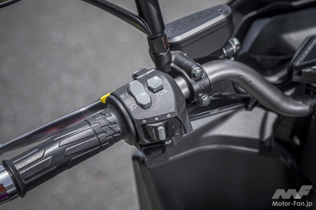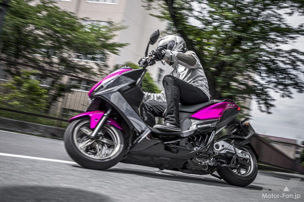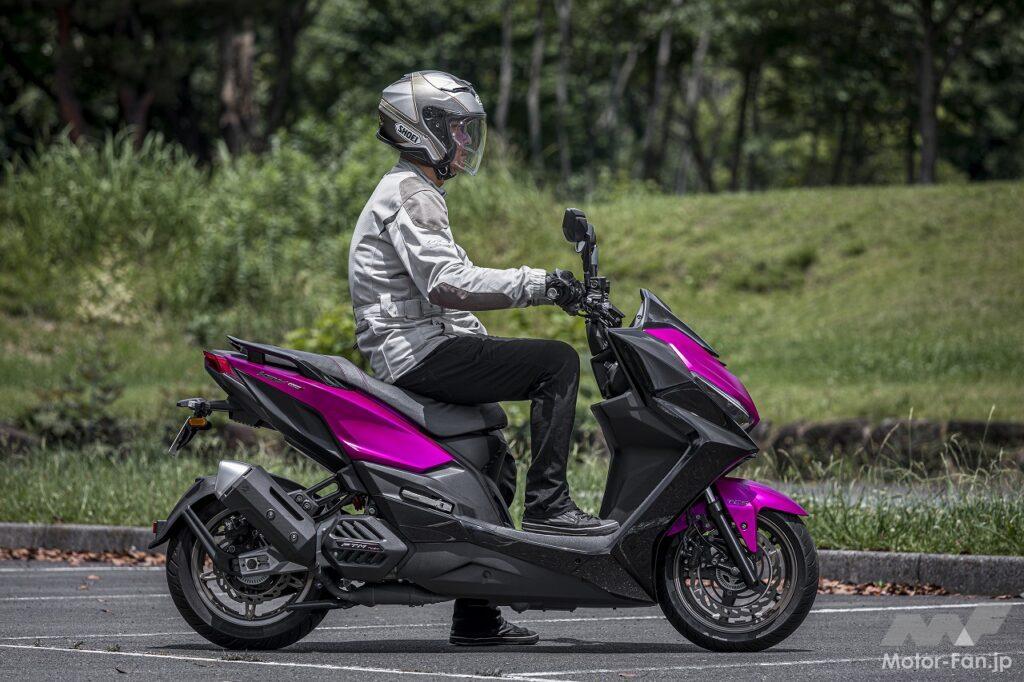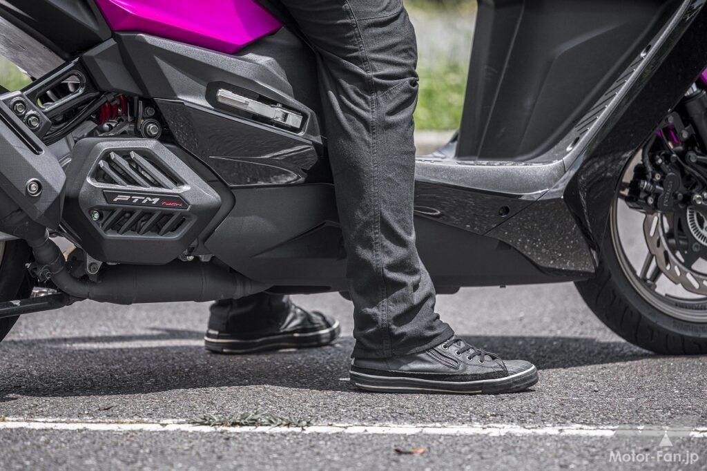 シートに座るというポジションはスクーターのそれです。アップハンドルによってもたらされるリラックスした上体も違和感がありません。フラットフロアなので乗降性が良いのも、ライダーの体格に関係なく使いやすい部分です。ただし足つき性はあまり良くありません。シート高は795㎜ということですが、足を下ろしたときに開き気味になるので、結果として足が着けにくくなっています。感覚的には欧州製のスポーツスクーターに近いといった印象を受けました。