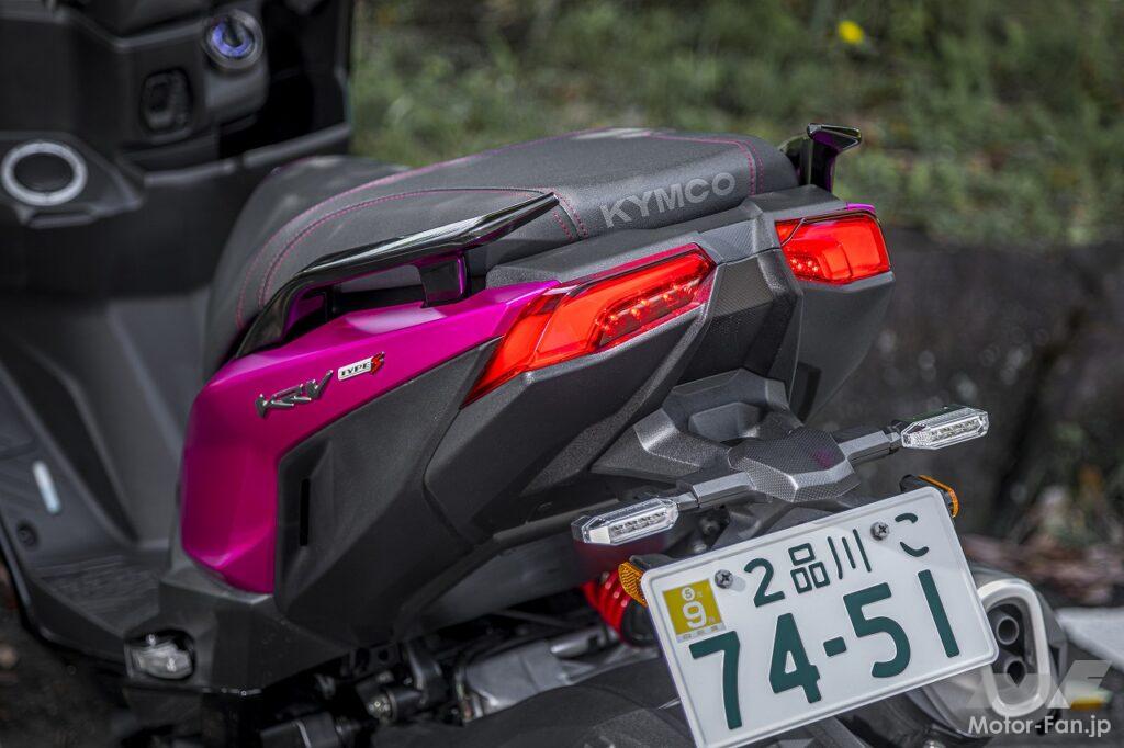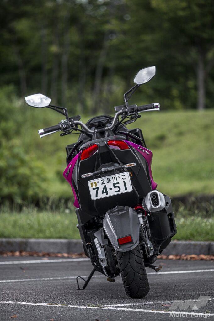 今回の試乗でもっとも印象的だったのがハンドリング特性でした。独立スイングアームによってロードホールディング性が良いことは、走りだしてすぐに実感します。一般的なスクーターの場合、段差を乗り越えたり荒れた路面を走るとバタバタと跳ねることが多く、リアタイヤの接地感は希薄です。しかしKRV180TCSはサスペンションがよく動いてくれ、タイヤをしっかりと路面に着けてくれます。低速ではフロント周りに重さを感じて、当初はそれが違和感として残ったのですが、スピードが高まるにしたがってナチュラルなハンドリングとなり、しかも軽快性も高まってきます。コーナーへのアプローチで車体をバンクさせる際にもスポーツバイクを操っているようにスーッと倒し込めるし、素早い切り返しにもしっかり追従してくれます。スポーツハンドリングという表現があるのかはわかりませんが、スクーターの域を超えた軽快でスポーティな走りを実現しているのはたしかです。ABS装備のブレーキの効き、コントロール性も高いし、つねに安定感があるので、トラクションコントロールと合わせて、どんな路面状況にも安心感を持って走行できると思いました。それでいてスクーターらしい実用性も兼ね備えているのですから、まさに万能型スポーツスクーターといえるんじゃないでしょうか。