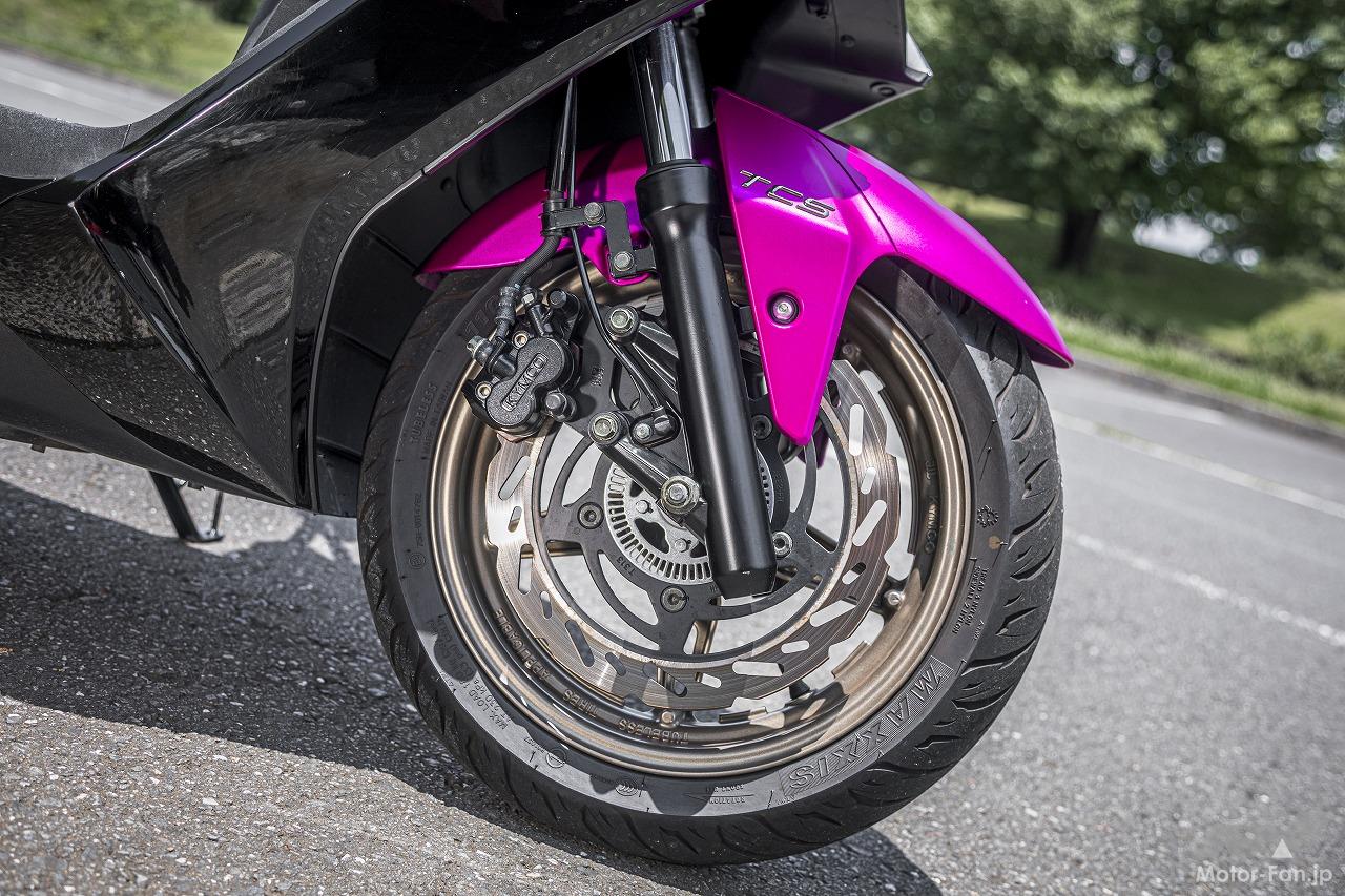スタイリングデザインはまさしくスポーツスクーターで、眼光鋭い精悍な表情を見せています。しかしながらフラットフロアを採用していて、実用性にも配慮している点が他とは一線を画しています。足回りに目を移すと、前後13インチのアルミホイールに、大径ローターを採用したディスクブレーキが装備してあり、高いスポーツ性を垣間見ることができます。そして、なんといっても最大の特徴が独立スイングアームを採用していることです。これはフラッグシップのAK550やヤマハTMAX560にも取り入れられているシステムで、スクーターで一般的なユニットスイング方式ではなく、エンジンとトランスミッションはフレームに搭載し、バネ下重量の軽減とともにサスペンションの作動性を大幅に高めることができるというわけです。まあ一般的なバイクと同じシステムということなのですが、だからこそスポーツスクーターとしての性能を高めるために必要なシステムともいえます。さらに、エンジンとトランスミッションをフレームへコンパクトに搭載するために、キムコ独自の技術であるPTM(Power Transmission Matrix)を採用しています。これによってエンジンを前方へ搭載することが可能になり、重心を前方へ移動することに成功しました。結果、前後の重量配分を約50:50と最適化することができたのです。いうなればKRV180TCSは、スクーターの概念を打破したATスポーツモデルということができるのです。
