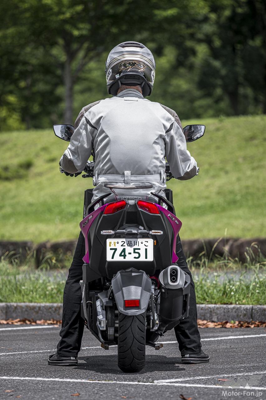 シートに座るというポジションはスクーターのそれです。アップハンドルによってもたらされるリラックスした上体も違和感がありません。フラットフロアなので乗降性が良いのも、ライダーの体格に関係なく使いやすい部分です。ただし足つき性はあまり良くありません。シート高は795㎜ということですが、足を下ろしたときに開き気味になるので、結果として足が着けにくくなっています。感覚的には欧州製のスポーツスクーターに近いといった印象を受けました。