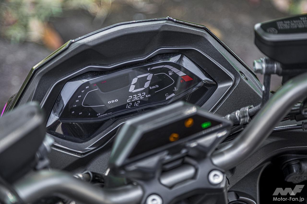 搭載するエンジンは、水冷4ストロークSOHC4バルブ単気筒で、排気量は175.1㏄。最近は150、160といった排気量のモデルが一般的になっていますが、それらより1割ほど排気量が大きく17psの最高出力を発揮します。出力、トルクともに150クラスと250クラスの中間的な性能ですが、これが一般道での加速性や高速走行での余裕につながっているのです。実際にスタートするとそれはすぐに理解できます。アクセルを開けたときのダッシュ力が強く、吹け上がりもダイレクトなので実にスピーディに走ることができるのです。パワーウェイトレシオは8.4kg/psを実現しているので、走りそのものが軽快に感じます。