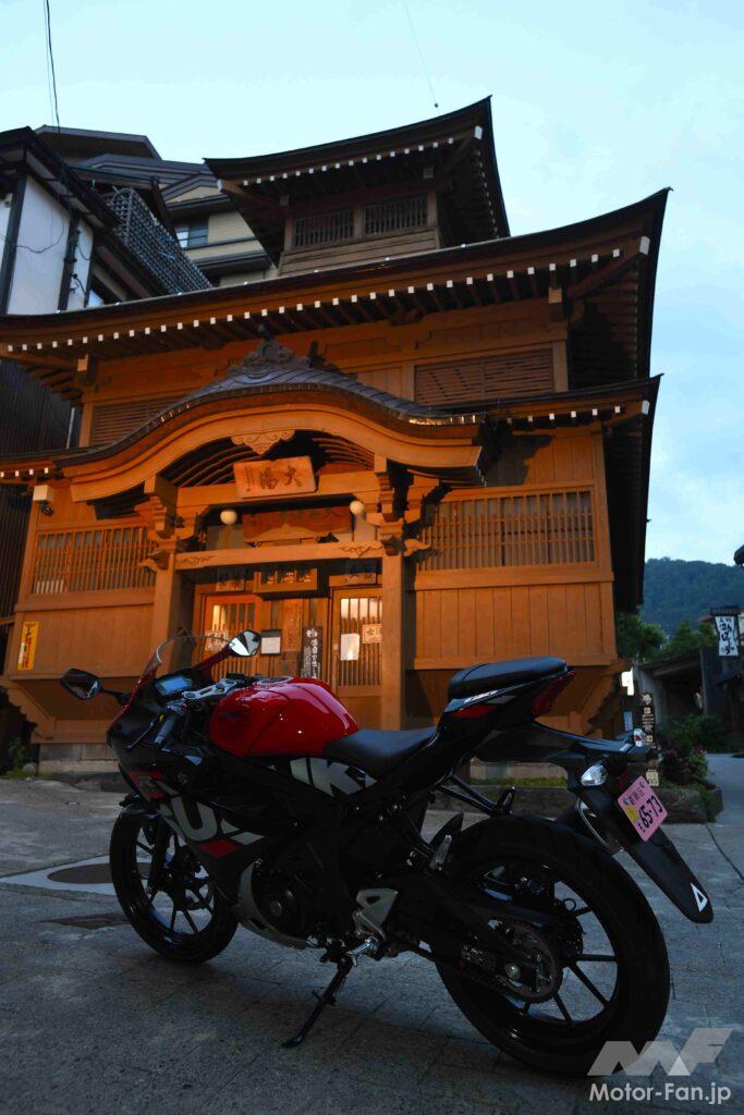 GSX-R125のツーリング能力を探る一泊二日の旅で、僕が目的地に設定したのは長野県の野沢温泉。東京都西部の自宅からの最短距離と所要時間は、ネットで調べると244km・6時間21分だが、実際の道中では要所で撮影を行ったりお気に入りのワインディングロードに寄り道したりしたため、総走行距離は約700km、自宅⇔宿の所要時間は初日:16時間/2日目:9時間に及んだ。
