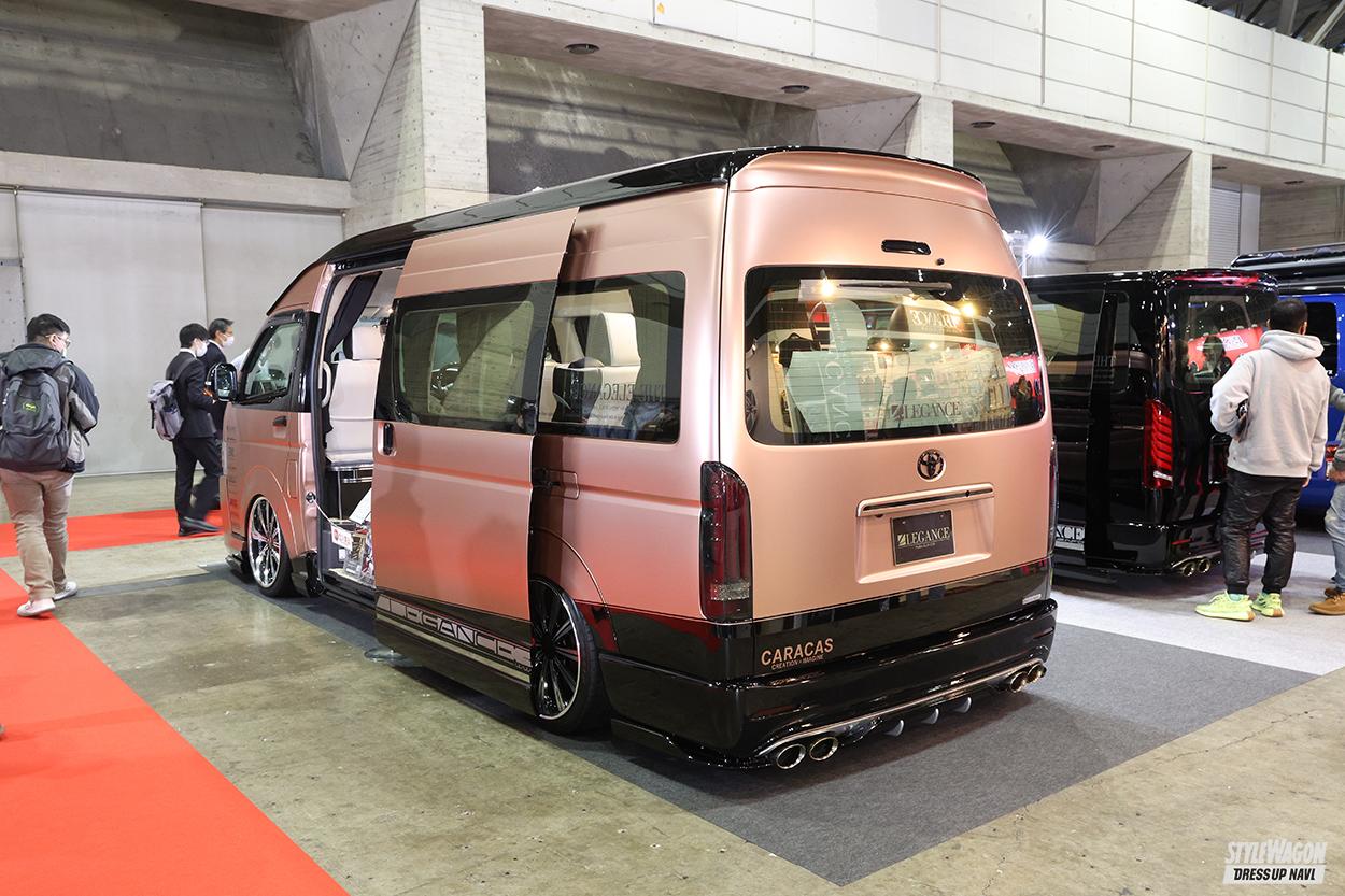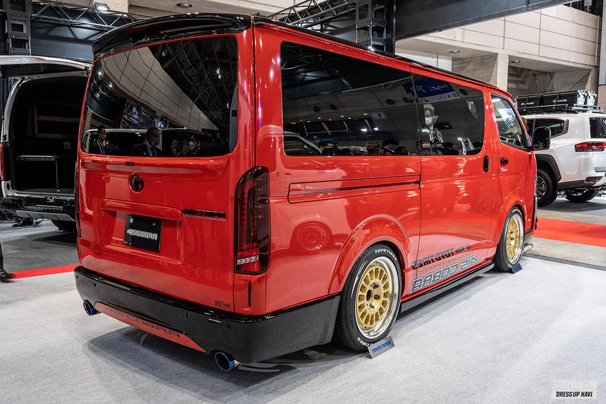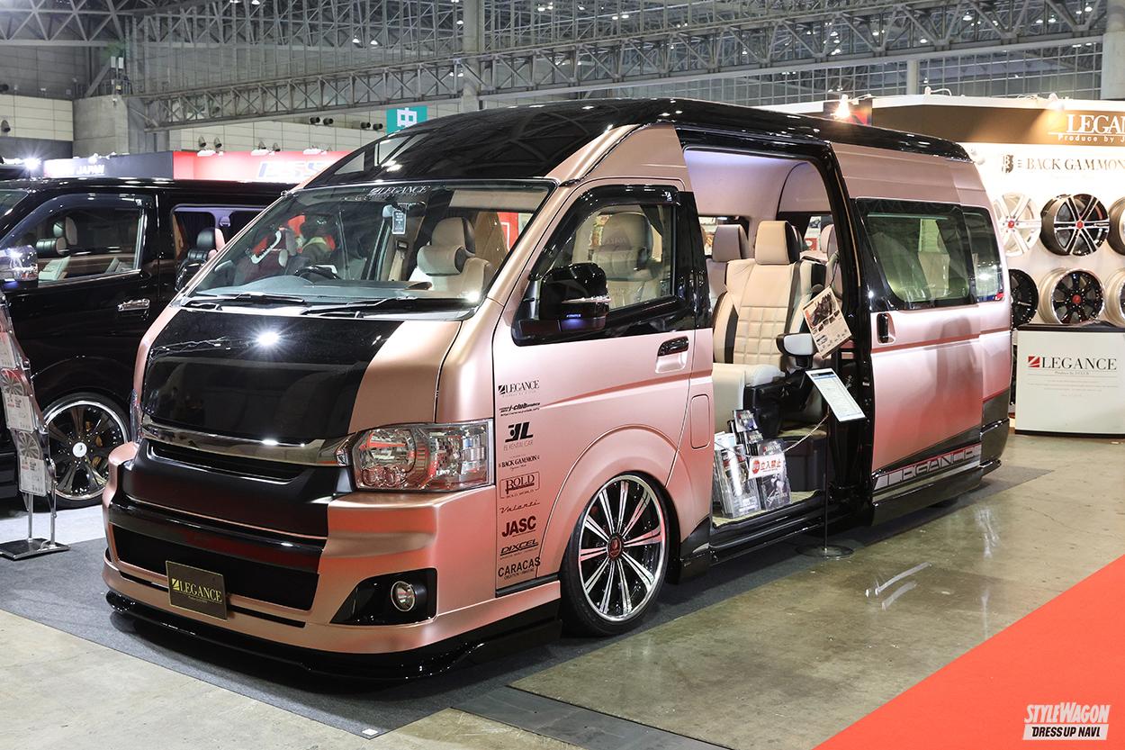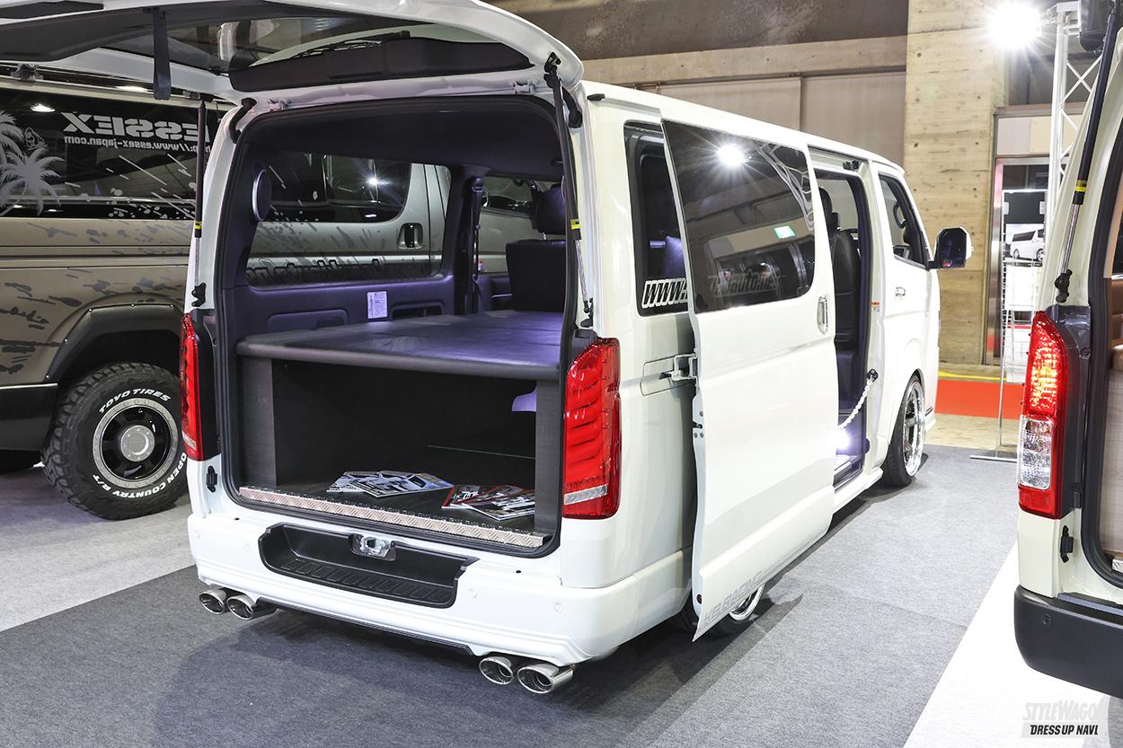 ハイエースのビジネス送迎用特装車、ファインテックツアラーをベースに、パティシエNEOのシートカバーやカウンターテーブル、ベッドマットなど贅を尽くしたラグジュアリーな空間を演出。独特のツートンボディカラーは、新型クラウンをモチーフとしたもの。その他、足回りはボルドワールドのエアサスを採用。202ブラックにオールペンされたナローモデルには、レガンスのフルバンパーを装着。