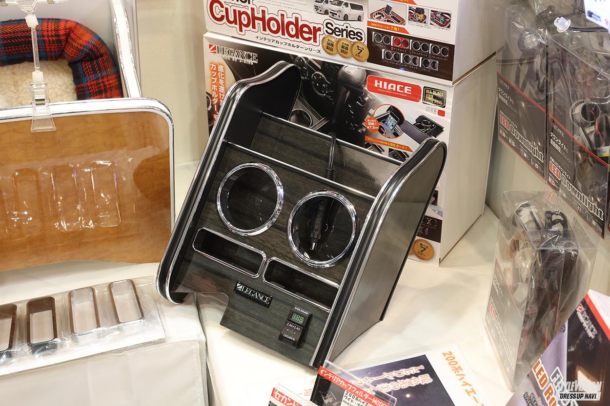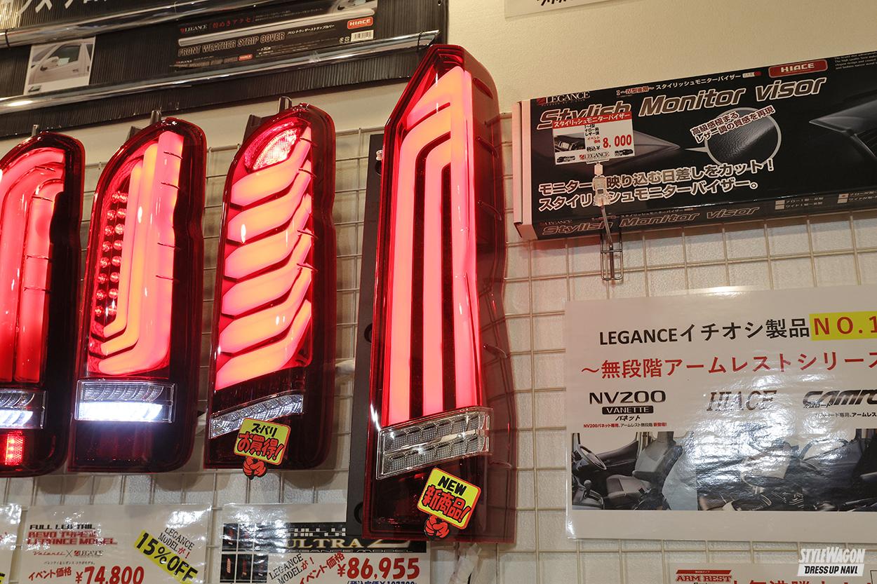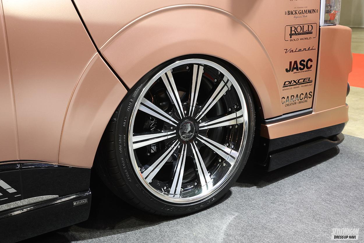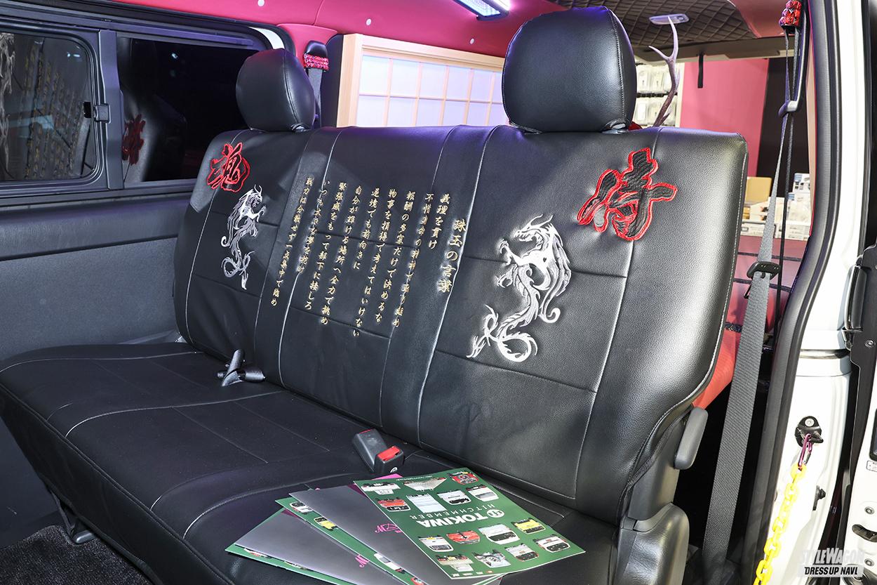 ハイエースのビジネス送迎用特装車、ファインテックツアラーをベースに、パティシエNEOのシートカバーやカウンターテーブル、ベッドマットなど贅を尽くしたラグジュアリーな空間を演出。独特のツートンボディカラーは、新型クラウンをモチーフとしたもの。その他、足回りはボルドワールドのエアサスを採用。202ブラックにオールペンされたナローモデルには、レガンスのフルバンパーを装着。
