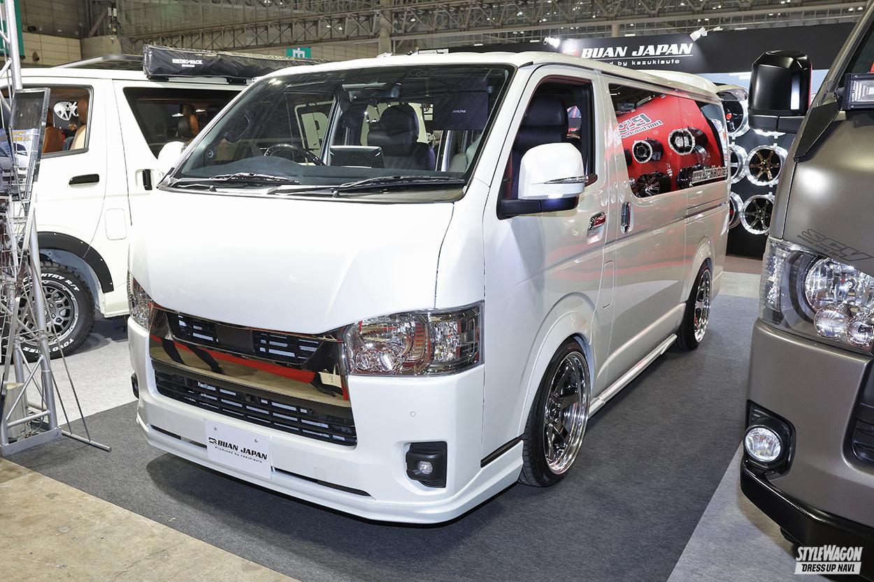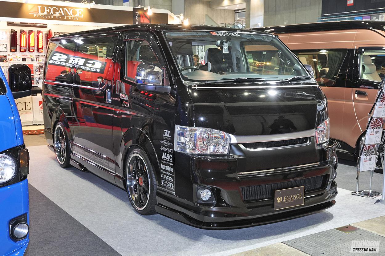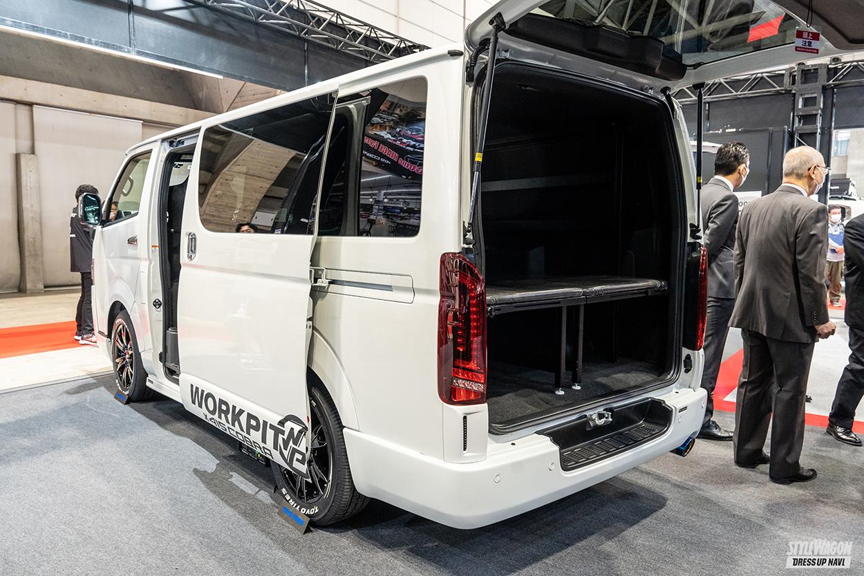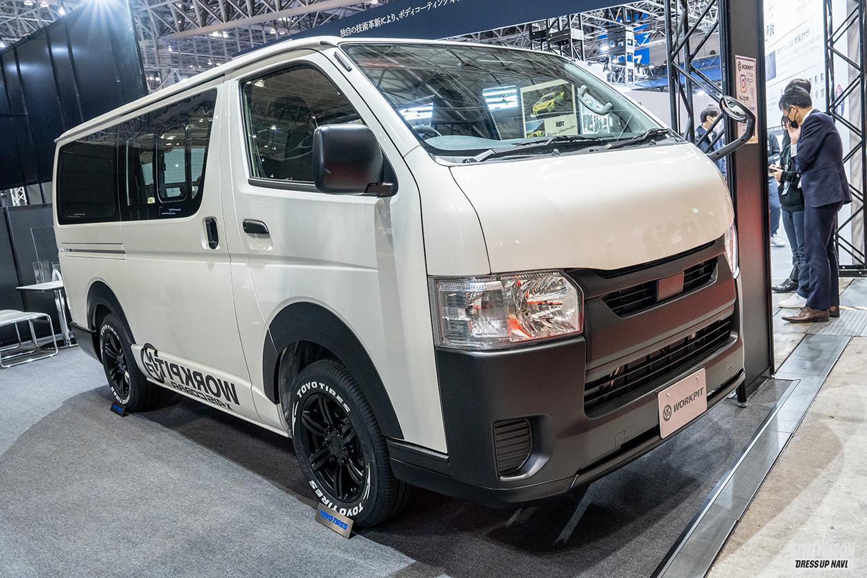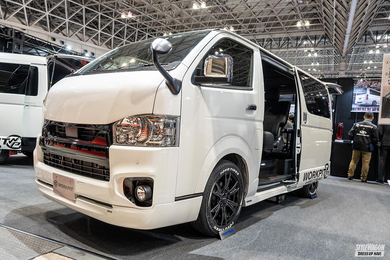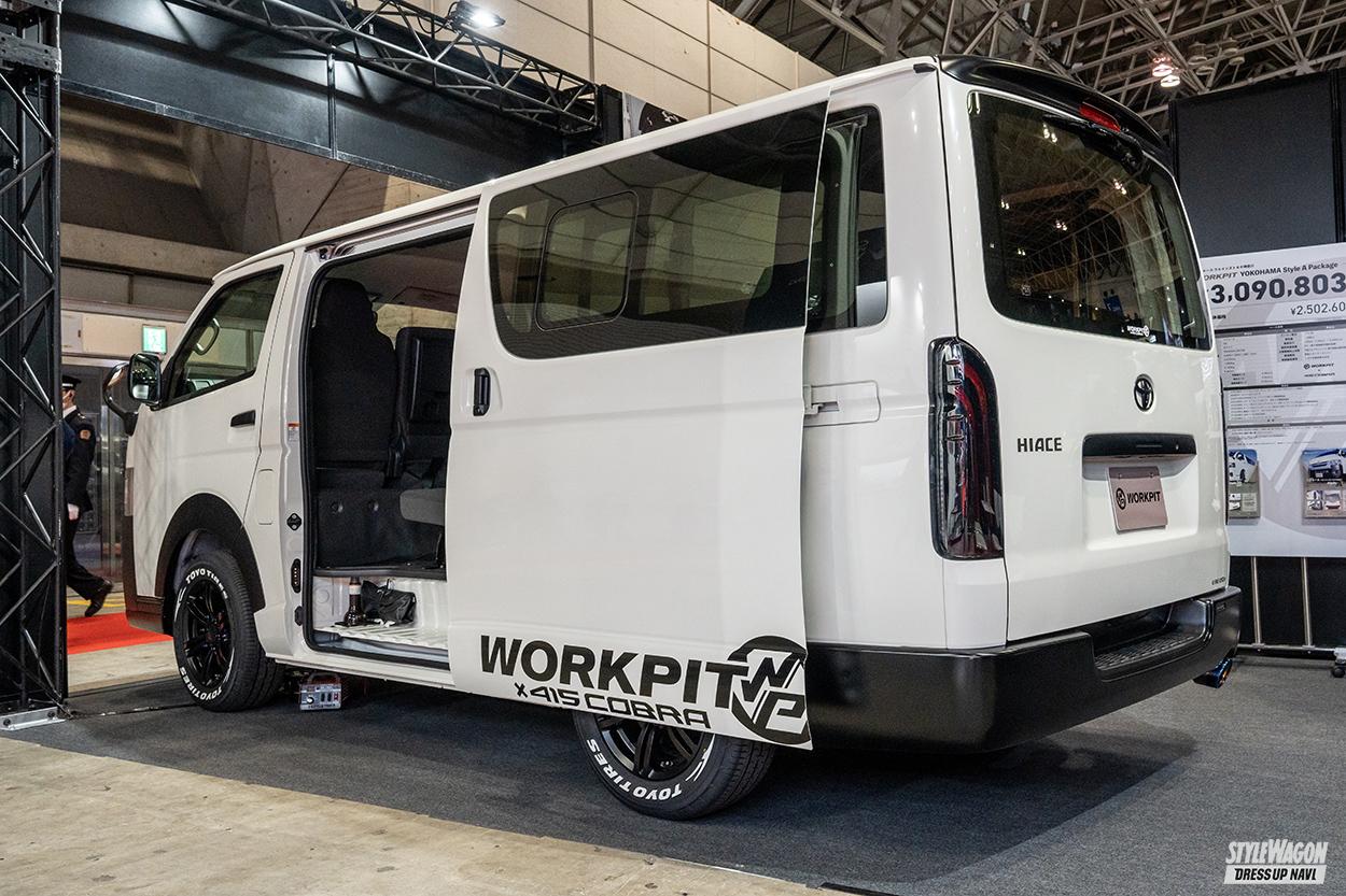 神奈川県下でトヨタディーラーを展開するウエインズトヨタ神奈川が運営する「ワークピット横浜」は、トヨタの商用車専門店。ビジネスユースでのカスタマイズはもちろんのこと、ドレスアップについても積極的に実施しており、今回は同店でもパーツを取り扱っている人気ハイエースカスタムブランドの「415COBRA」とのコラボブースを出展。遊び心溢れるハイエースたちを展示していた。