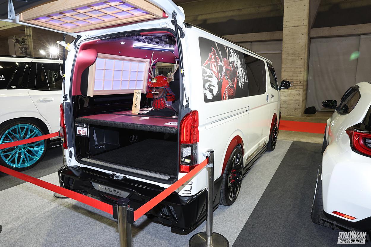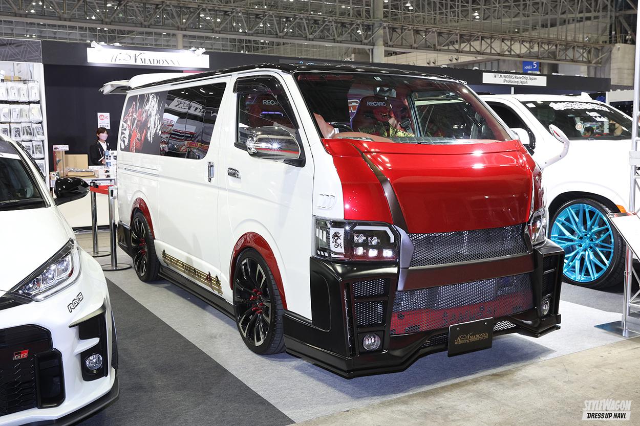 内外装のカスタマイズからキャンピングカー製作まで幅広く手掛けるMDNマドンナ。最新デモカー「侍」は戦国武将、真田幸村をイメージとした独特な世界観を表現。各部に取り入れられた赤色は、真田幸村の「赤備え(あかぞなえ)」を意識したもの。エアロパーツはオリジナルのダークネス。エンジンはインタークーラー付きスーパーチャージャー仕様で、ミッションも5速MTに換装。さらにブレーキは380φローターのブレンボ製に変更するなど、走りも抜かりナシ!