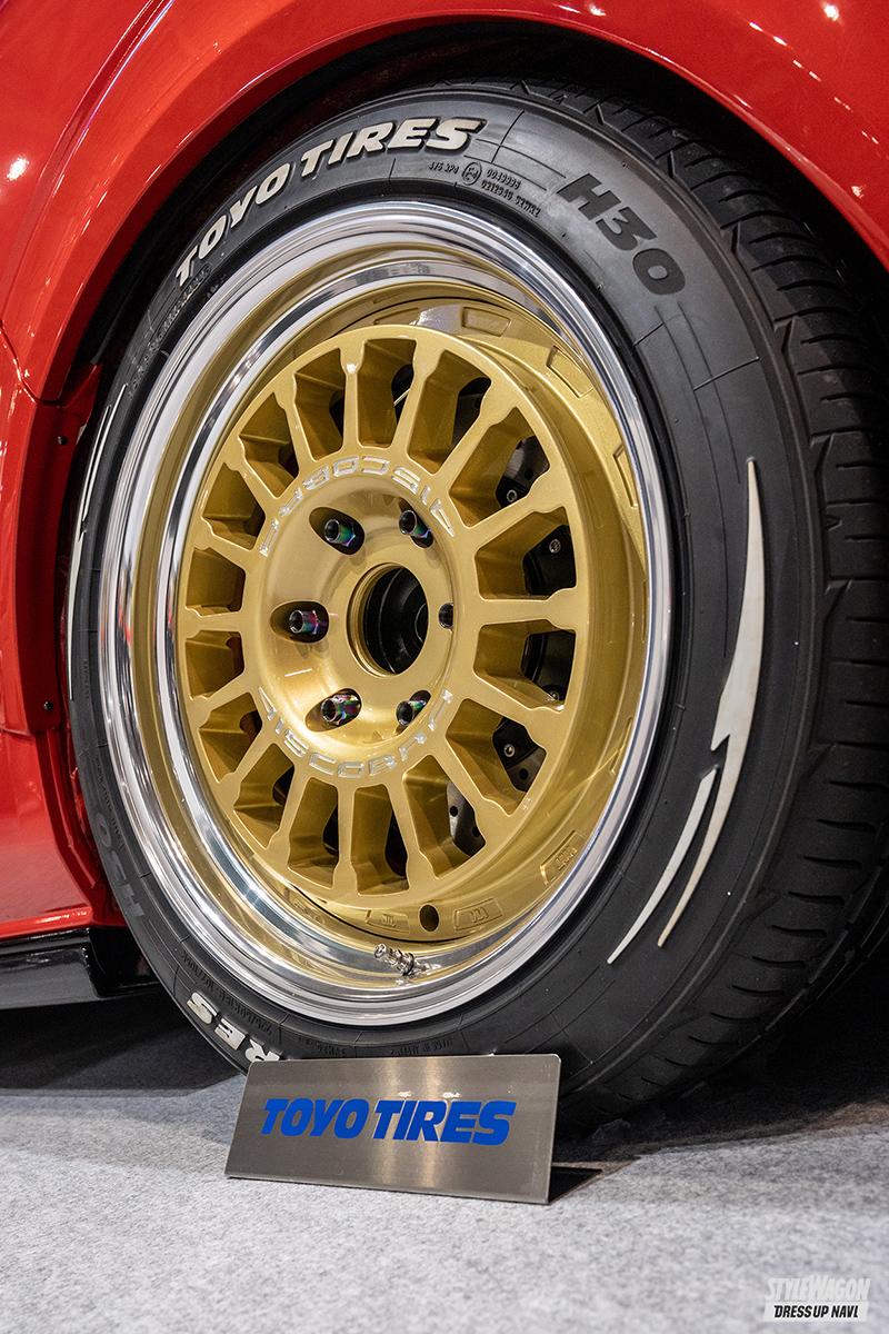 シンプルさの中にも独自の個性が映える、ブアンのGT-Sボディキットを各部に投入。20mmワイドのオーバーフェンダー内に収まるのは、ダークメッキフィニッシュのKBレーシング。カーゴスペースにはボックスベッドキットも備わる。