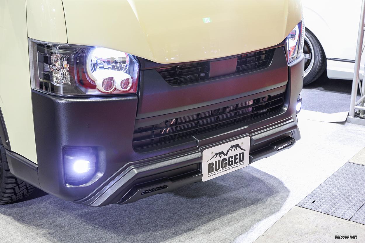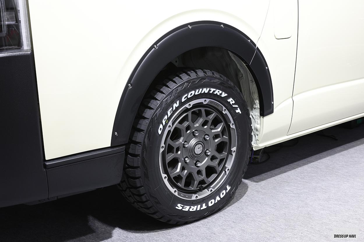 ブアンジャパンからの提案は、アゲ風に見えるノーマル車高カスタム。その隠し味となっているのがアップスタイルフェンダーと名付けられた、アーチを一切カブらせないオーバーフェンダー。素材にはそのままポン付け可能なAESを採用。ホイールは今回のサロンで発表された「ラギッドロック」。ゴツゴツとしたフェイスデザインは、ブロックパターンのクロカンタイヤにもジャストフィット!