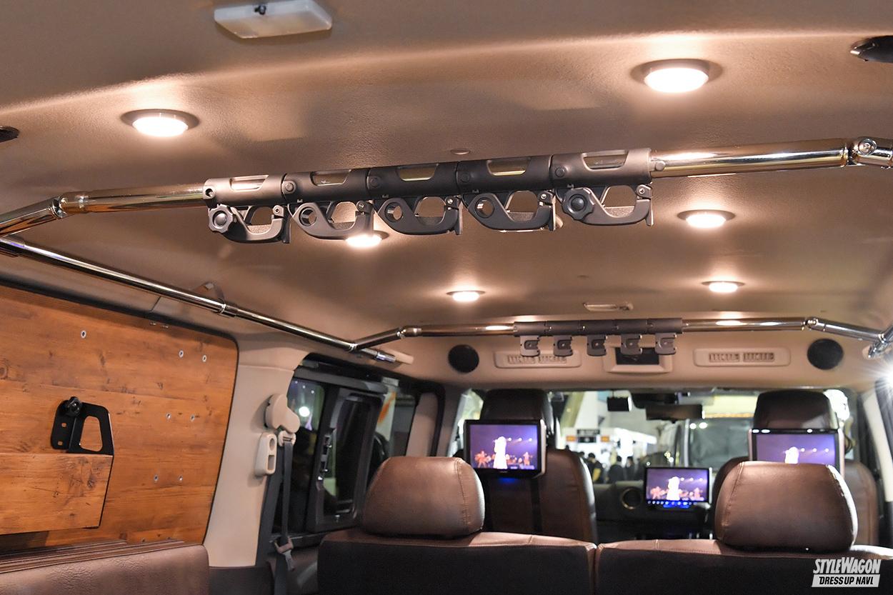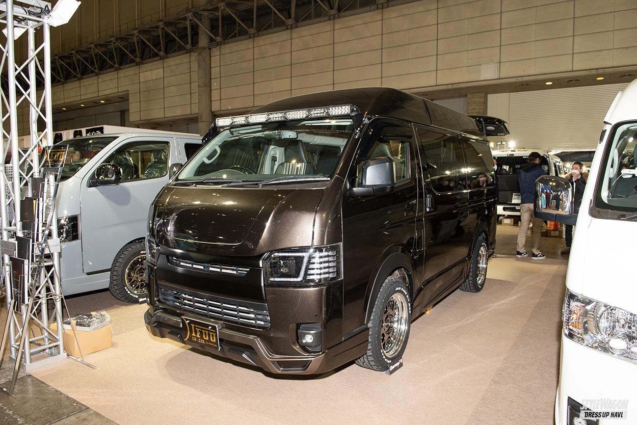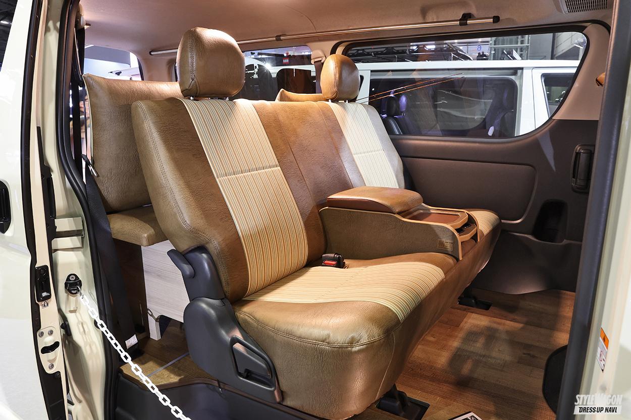 家族や仲間とのお出かけに便利な、実用性の高いワンボックスカスタムを提案する威風の最新作は、見過ごされがちだったウェルキャブ(福祉車両)をベースとしたリノベーションカー。小窓付きハイルーフ車ならではの開放感を存分に活かした2段ベッドを搭載するほか、多彩なシートアレンジが可能。4ナンバーのまま8人乗りを実現した新作キャラバン含め、選択肢の幅がさらに広まった。ちなみに両車が装備するエアロはダイナスティの新作、グランドだ。