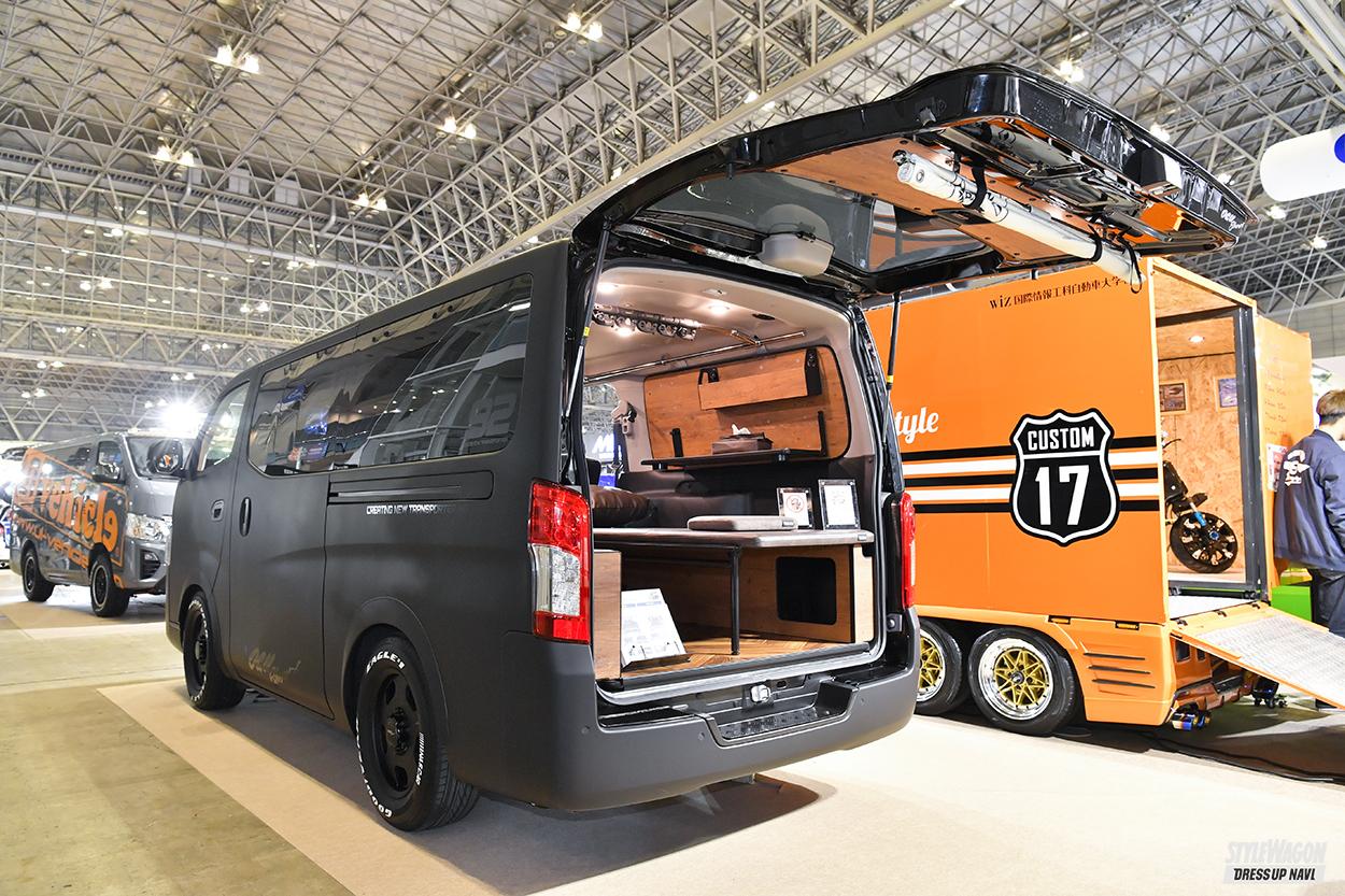 ニッサンのキャラバンをベースに、機能性と耐久性、快適性を追求した高品位なトランスポーター、TXシリーズのESコンセプト。ビンテージ感が薫る木質「Xyloid」と厳選したレザー&キルト素材を組み合わせた室内には、オリジナルのベッドやシートカバーだけでなく、アルパインのビッグXやバックドア電動シェードなどの最新装備が満載。エクステリアはマットブラックのフルラッピングや、フロントラインのオグショーバージョンホイールなどでシックに。