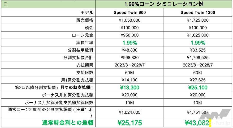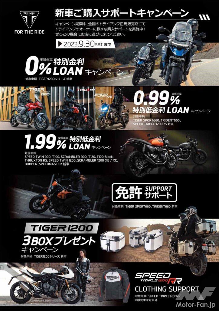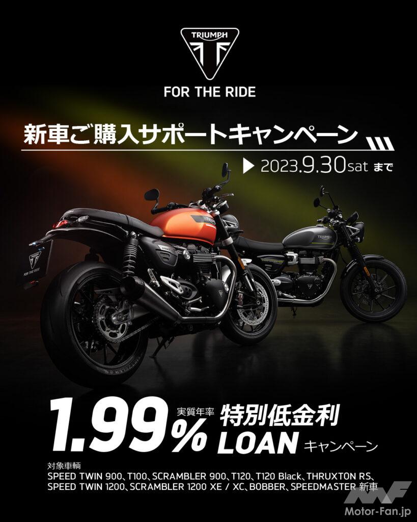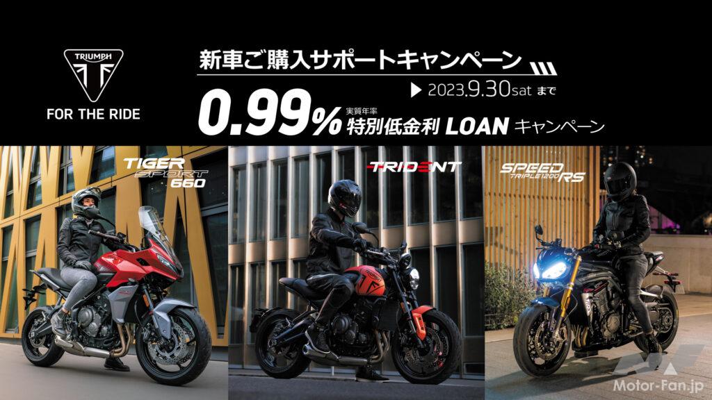 - 内容:キャンペーン期間中、全国のトライアンフ正規販売店にて対象車両を成約、且つローン契約完了した方に、「0.99%特別低金利ローン」を提供。