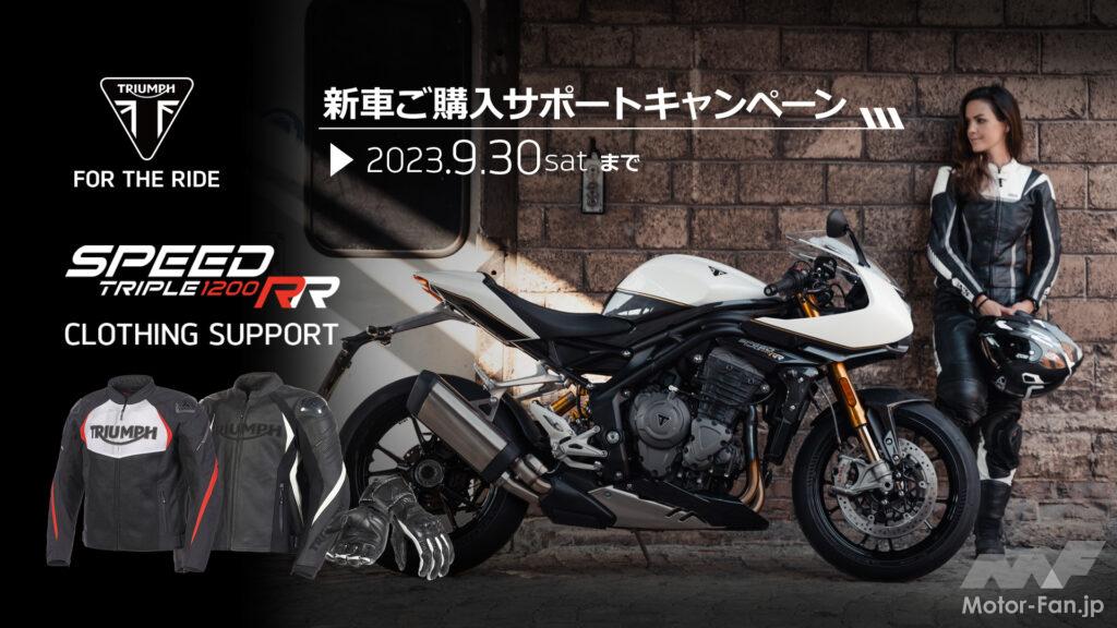 - 内容:キャンペーン期間中、全国のトライアンフ正規販売店にて対象車両をご成約、且つご登録されたお客様に「5万円分(税別)のクロージング(衣類)をプレゼント」。