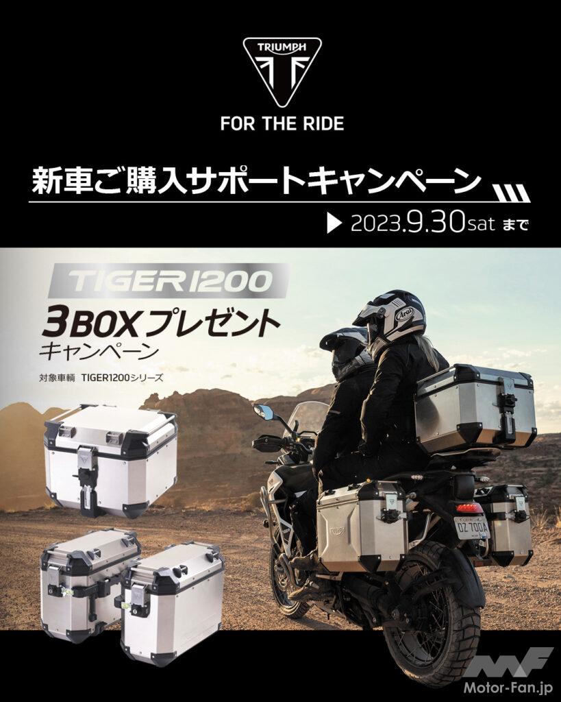 - 内容:キャンペーン期間中、全国のトライアンフ正規販売店にて対象車両を成約した方に、トップボックスとサイドパニアケースをプレゼント。