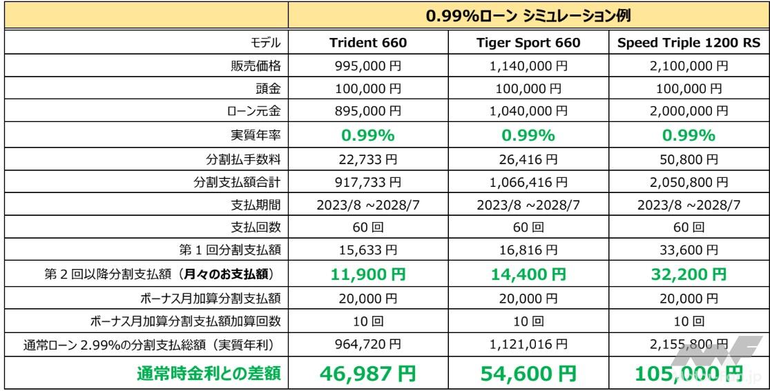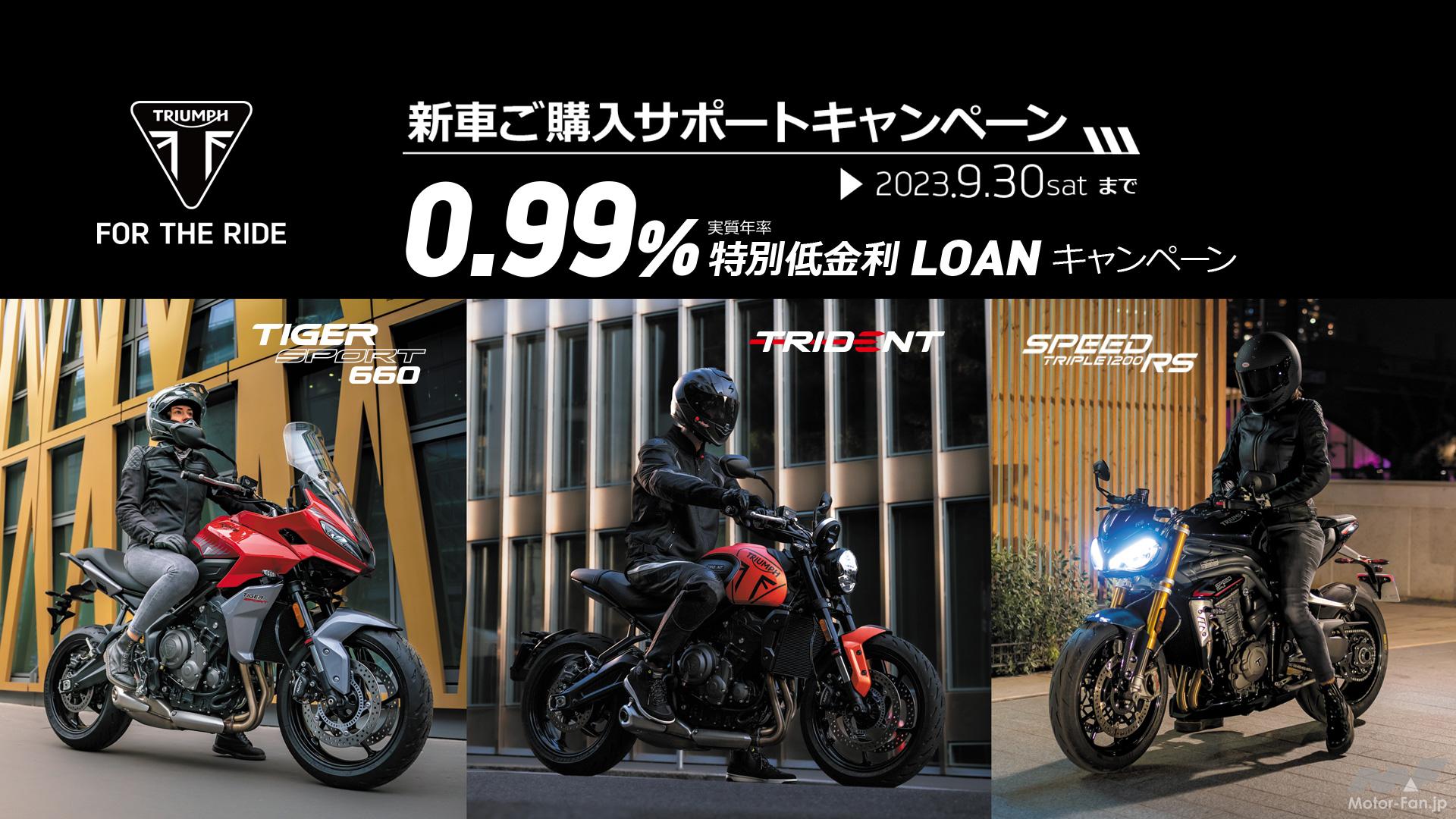 - 内容:キャンペーン期間中、全国のトライアンフ正規販売店にて対象車両を成約、且つローン契約完了した方に、「0.99%特別低金利ローン」を提供。
