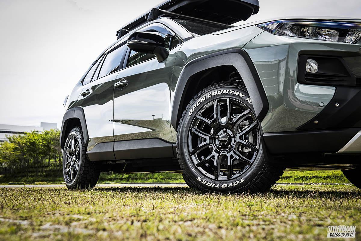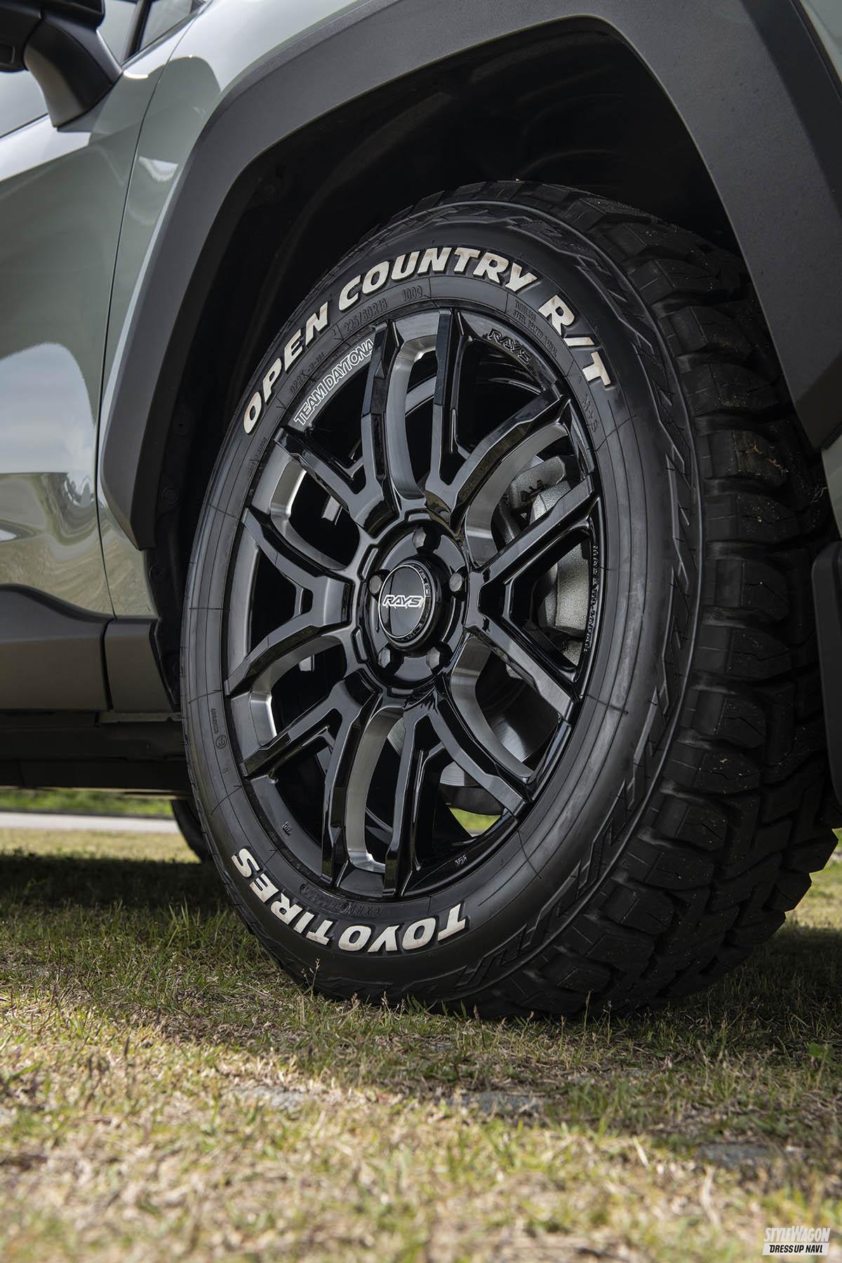 18インチ化の心強い味方となるのがデモカーの履くタイヤ『トーヨー・オープンカントリーR/T』の存在。その性能の高さはここでは割愛。注目すべきはRAV4にマストなサイズである“225/60R18”が設定されている点。しかもドレスアッパーにうれしいホワイトレター仕様だ。また、このサイズは純正Gグレードと同サイズなので、干渉などを心配せずに履きやすい。
