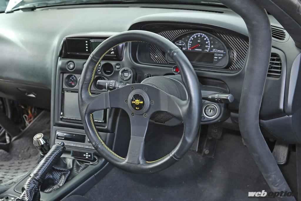 室内はストリート仕様そのもの。メインメーターはデフィのスーパースポーツクラスターで集中管理。ロールケージも剛性と安全性を高める目的で組み込んでいる。