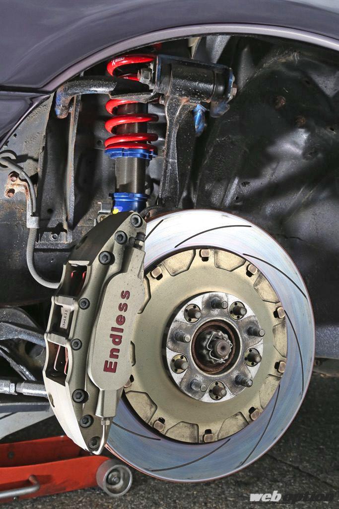 足回りは、ジールファンクションベースのアドミクス車高調(F14kg/mm R12kg/mm)を軸にセットアップ。リヤのLSDはATSのカーボンを投入している。ブレーキは前後ともエンドレスのキャリパーキットで武装。第二世代GT-Rは車重に対して純正のブレーキがプアなので、グリップレベルを引き上げてサーキット等を走るなら大容量化は必須だ。
