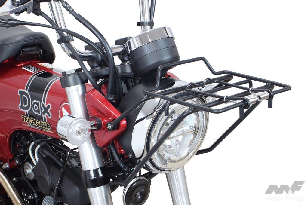 通勤・通学時に使用するカバン、ツーリング等に必要な雨具や小物、シュラフ等が積載できる、ダックス125専用のフロントキャリア。装着には加工の必要がなく、ボルトオンで簡単に取り付け可能。表面は強度をアップするブラック塗装を実施。許容積載量は1.0kg。