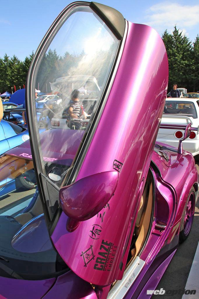 自慢のパーツのひとつがRE雨宮の電動ガルウイングで、ドアに取っ手がないのが電動の証。ガルウイング化はスタイリング面でのメリットだけでなく、左ハンドル車の乗降時の必須パーツなのだという。