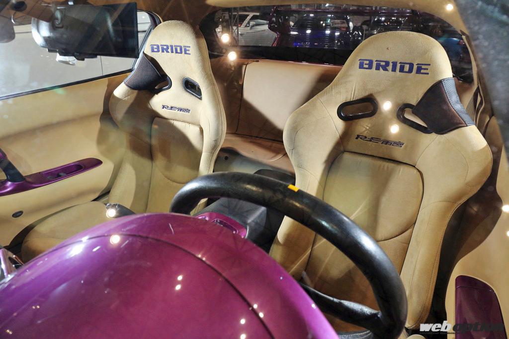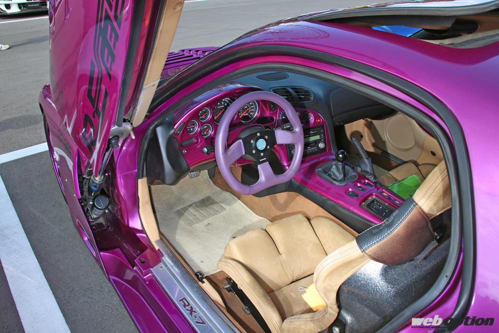 インテリアのカスタマイズも抜かりなし。ダッシュボードや各パネル類、Dシェイプのステアリングは、ボディと同色の瀧川一郎パープルでペイント。シートはRE雨宮仕様のブリッド・ストラディアII、カーペット類と合わせてアイボリー系のカラーでまとめ上げている。