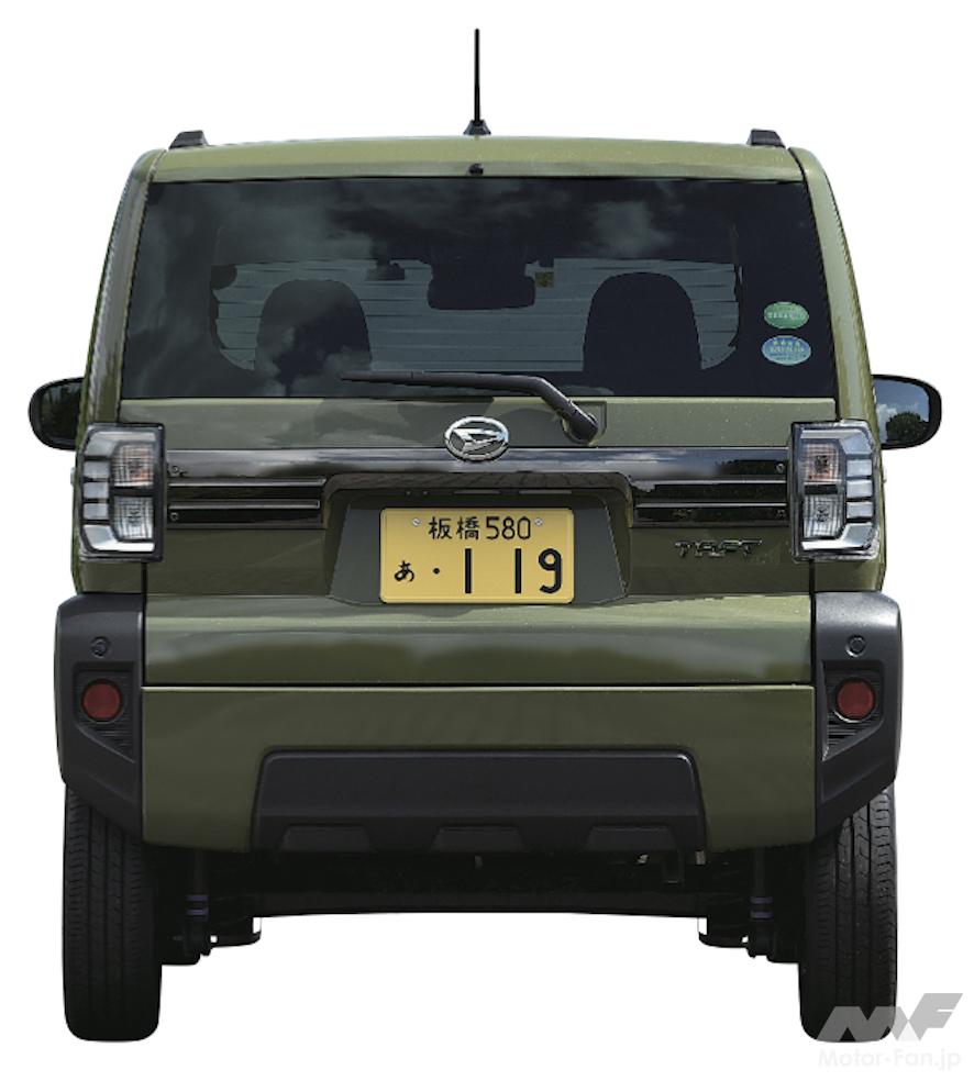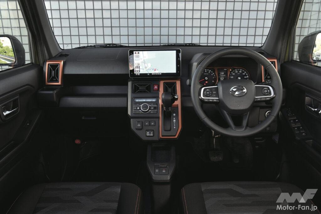 タフトはSUV感覚の軽自動車で、直線基調の比較的背の高いボディを備える。フェンダーのホイールアーチには、ブラックの樹脂製ストーンガードも備わり、SUVらしさを強調した。最低地上高も190mmと高いから、悪路のデコボコも乗り越えやすい。車内に入ると、インパネなどの内装も直線基調だ。質感は特に高くはないが、ATレバーやエアコンのスイッチがシンプルに配置されて操作性に優れる。