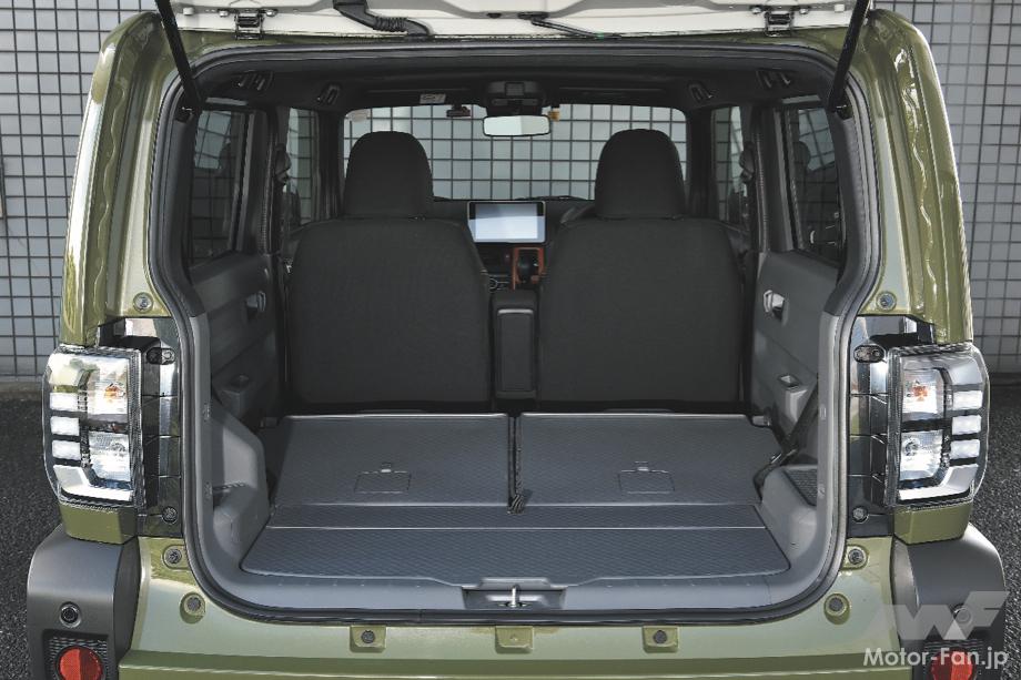 ほかの軽自動車と異なる特徴は、前席は居住空間として、後席は畳んで使う荷室と割り切ったこと。荷室には汚れを落としやすい素材が使われ、内装色も前席はブラック、後席はグレーと区分した。「G」に装着される車内側のドアハンドルも、前席はメッキだが、後席は樹脂製だ。後席はシートアレンジもシンプルで、背もたれを前側に倒せるだけ。前後スライド機能は備わらない。