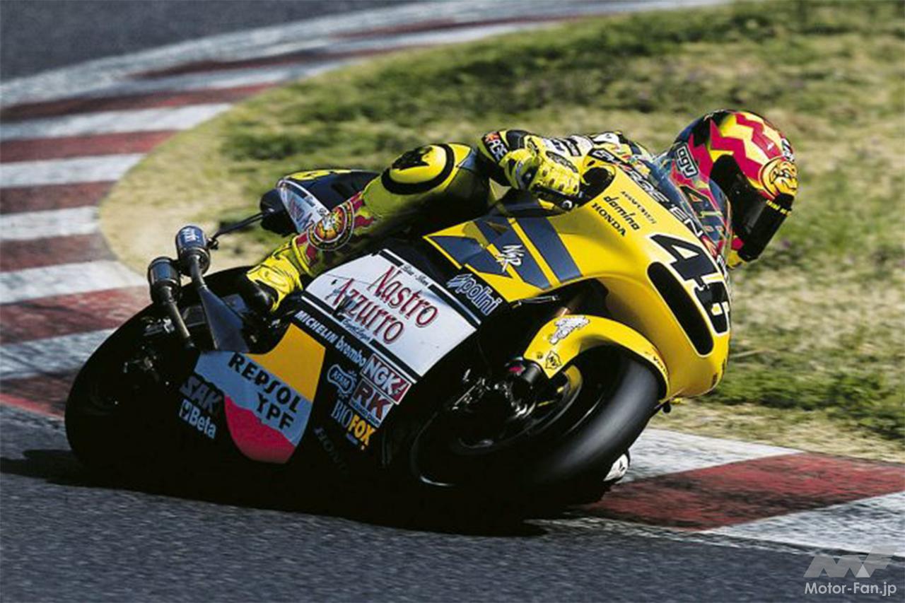 2000年には世界GP500ccクラスにホンダワークス(ナストロアズーロ・ホンダ)として参戦し、2年目の2001年にはシリーズチャンピオンを獲得。また世界GP最高峰クラスが2ストローク500ccクラスから、上限4ストローク990ccの「MotoGPクラス」へと変わった初年度の2002年、ロッシはシリーズチャンピオンを獲得しました。