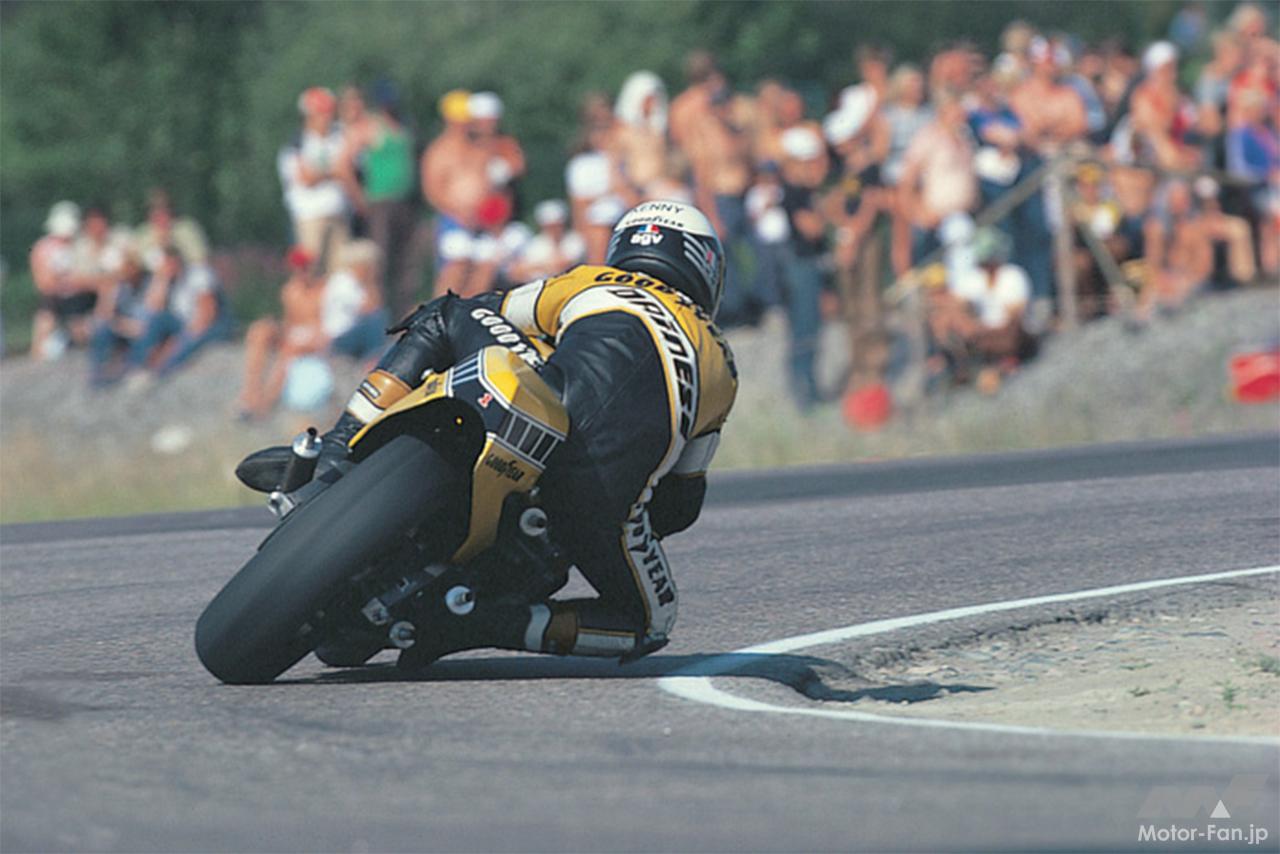 しかしダートトラック出身の米国人であるケニー・ロバーツは、ダートの手法をロードに応用。臀部を内側に落とし込み、地面に膝を擦りつけてバンク角を探る、これまでのコーナリングスタイルとは明確に異なる「ハングオフ(国内ではハングオンとも呼称)」と呼ばれる独自のコーナリングスタイルを確立。これにより、“既存のGPライダーやメーカー開発陣が考える、タイヤのグリップ力や足周りの限界値”をクリアしました。