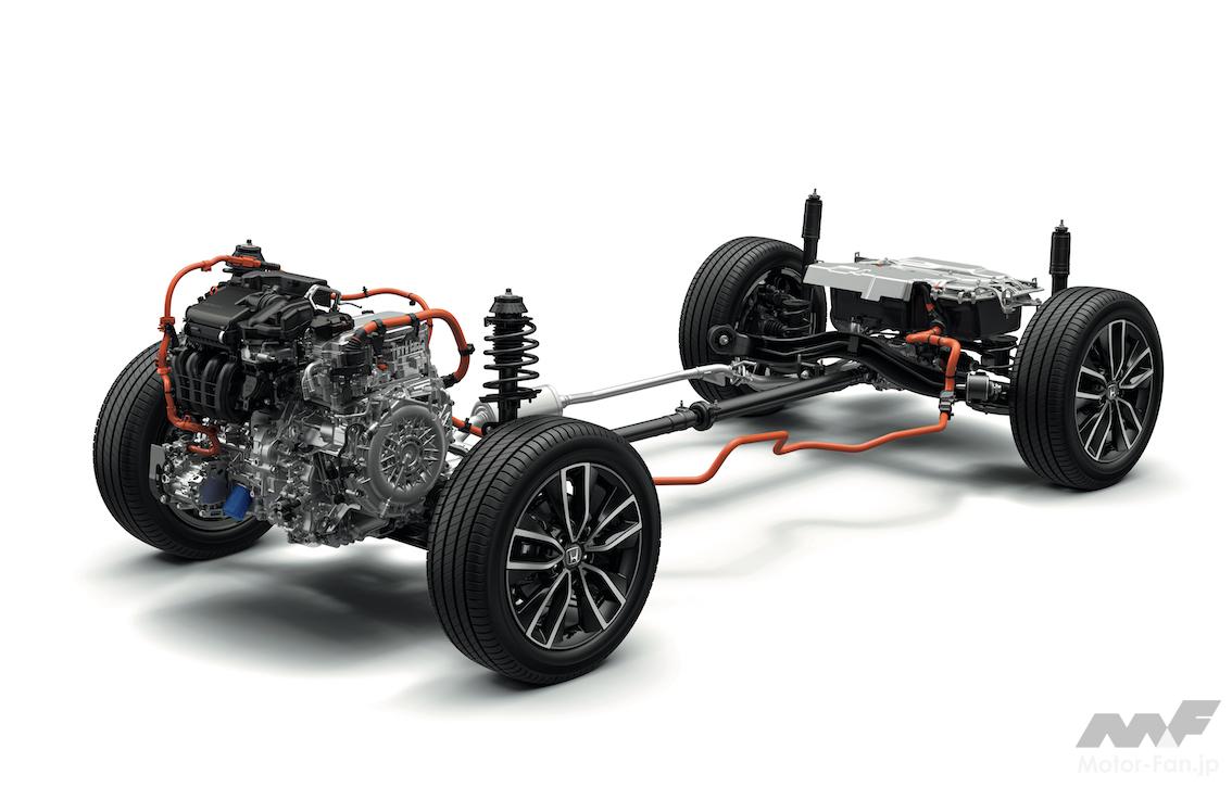 ヴェゼルe:HEVはFFと4WDを設定している。4WDは、リヤまでプロペラシャフトを通して駆動力を伝達する4WDだ。これはスバルと同様。つまり、最近トレンドとなっているリヤにモーターを積んで駆動する(そうなるとプロペラシャフトは不要)モーター4WDではないということだ。