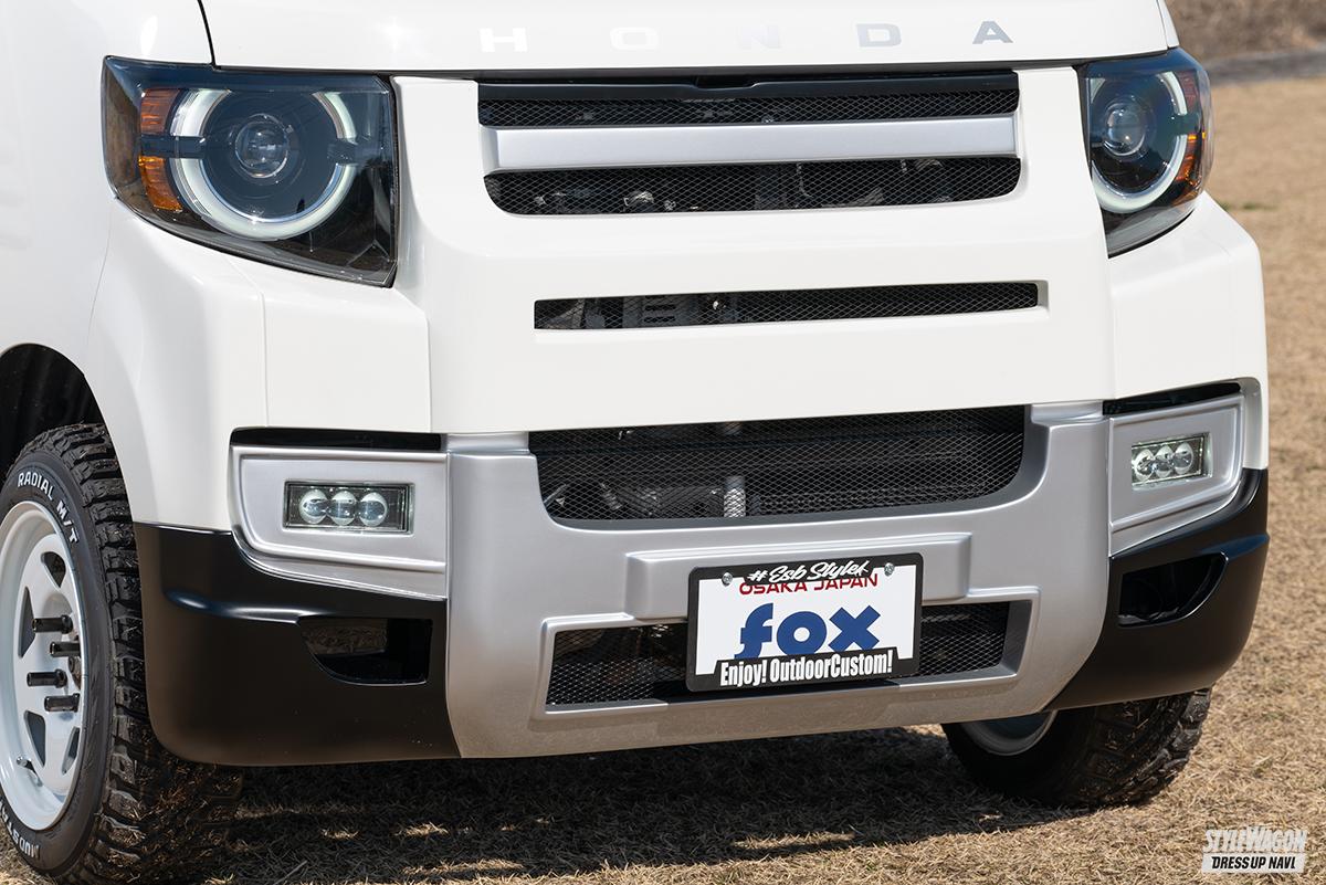 そんな折に新たに誕生してきたのがCLSのFOX。FOX=キツネで、キツネ=化かすの連想から名付けられたシリーズだが、このアプローチが断然オモシロイ。前後バンパーと前後のライトカバーというシンプルなパーツ構成でありながら、装着すればプロボックス、Nバンのそれぞれが、まるでディフェンダーな姿へと化けてくれるのである。